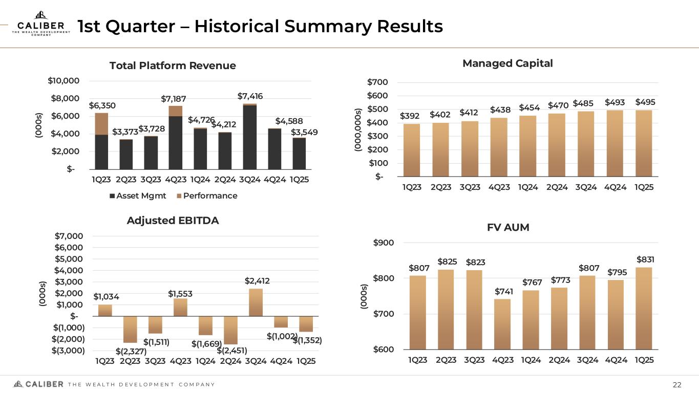 1Q25 – Summary Highlights 21T H E W E A L T H D E V E L O P M E N T C O M P A N Y Financial Measures Metrics Corporate • Fair value assets under management of $831 million • Managed capital of $495 million • Platform revenue of $3.5 million, primarily driven by asset management revenue • Platform net loss attributable of $4.1 million, or $3.59 per diluted share, • Platform Adjusted EBITDA loss of $1.4 million • On March 17, 2025, Caliber announced an offering of Series AA Cumulative Redeemable Preferred Stock had been qualified by the U.S. Securities and Exchange Commission (“SEC”) and that the Company is seeking to raise up to $20 million through the offering. • On March 27, 2025, Caliber announced the launch of its 1031 Exchange Program, a tax-deferral strategy that allows real estate investors to sell a property and reinvest all of the proceeds into a like-kind property while deferring capital gains taxes. • On April 22, 2025, Caliber announced the recent Phoenix City Council’s unanimous approval of the Company’s Canyon Village redevelopment project, a retrofit of a distressed +300,000 square foot office building to a 376-unit rental multifamily residential building. The project also benefits from opportunity zone tax incentives. • On May 8, 2025, Caliber announced that Caliber Hospitality Development (“CHD”) has entered into a Development Rights Agreement with an affiliate of Hyatt Hotels Corporation (NYSE: H) to exclusively develop 15 new Hyatt Studios hotels in target market areas within Arizona, Colorado, Nevada, Texas and Louisiana. • On May 9, 2025, Caliber announced it closed a $22.5 million refinance on the Doubletree by Hilton Hotel in Tuscon, AZ, which is a holding of a Caliber-managed opportunity zone fund. The new $22.5 million loan was refinanced with a unit of Citibank at a fixed rate of 7.43% maturing in June 2030. Proceeds will be utilized for reinvestment across the Fund's portfolio.