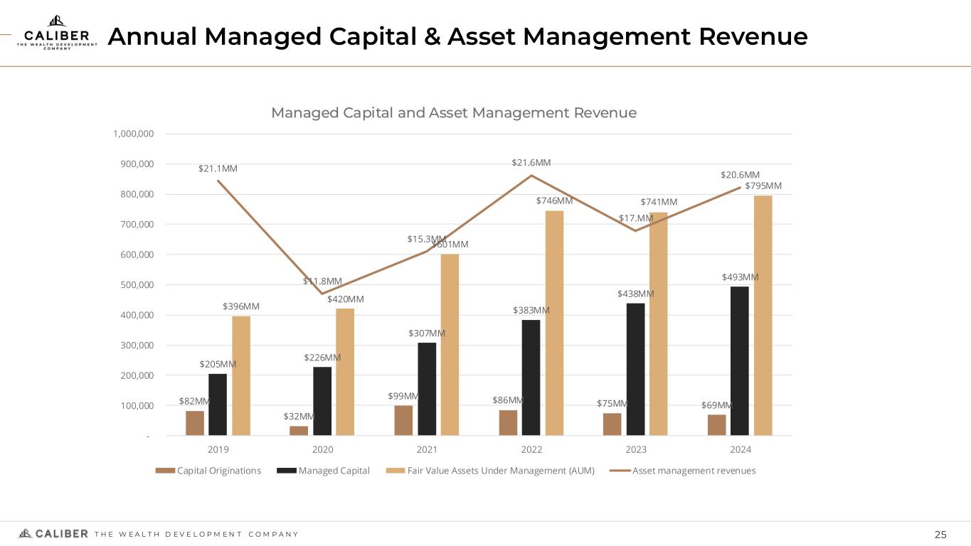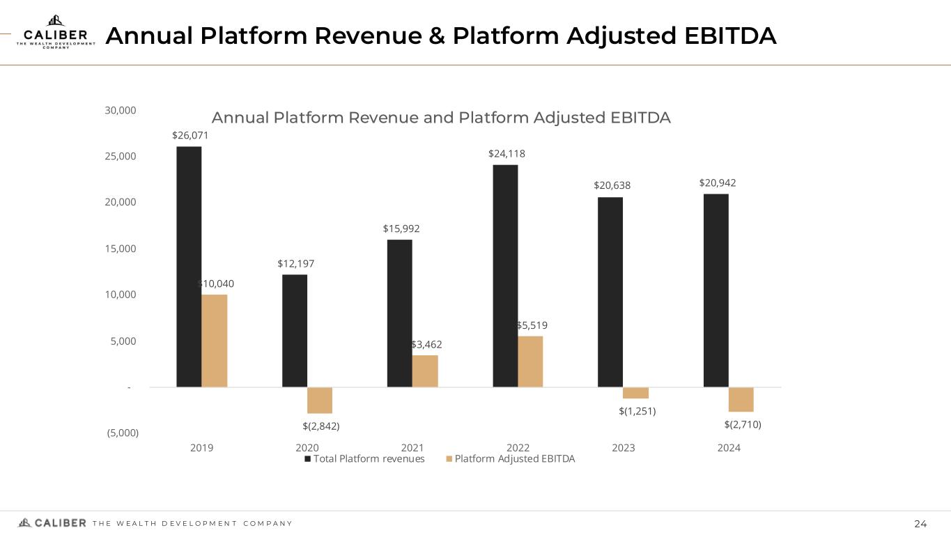 $22,951 $7,261 $- $5,000 $10,000 $15,000 $20,000 $25,000 $30,000 $35,000 1Q24 1Q25 (0 0 0 s) Total Consolidated Revenue* 1st Quarter Summary Results 23T H E W E A L T H D E V E L O P M E N T C O M P A N Y Source: Caliber reports Net Loss (per common share) $(3.53) 1Q24 $(3.85) 1Q25 $4,726 $3,549 $- $2,000 $4,000 $6,000 $8,000 $10,000 1Q24 1Q25 (0 0 0 s) Total Platform Revenue Asset Mgmt Fees Performance Allocations Platform Adj. EBITDA (Loss) (000’s) $ (1,669) 1Q24 $(1,352) 1Q25 *As previously communicated, Caliber has simplified the presentation of its financial performance by deconsolidating certain assets from the Company’s financials. As a result, the year-over-year comparisons of Caliber’s GAAP financial performance are not meaningful.