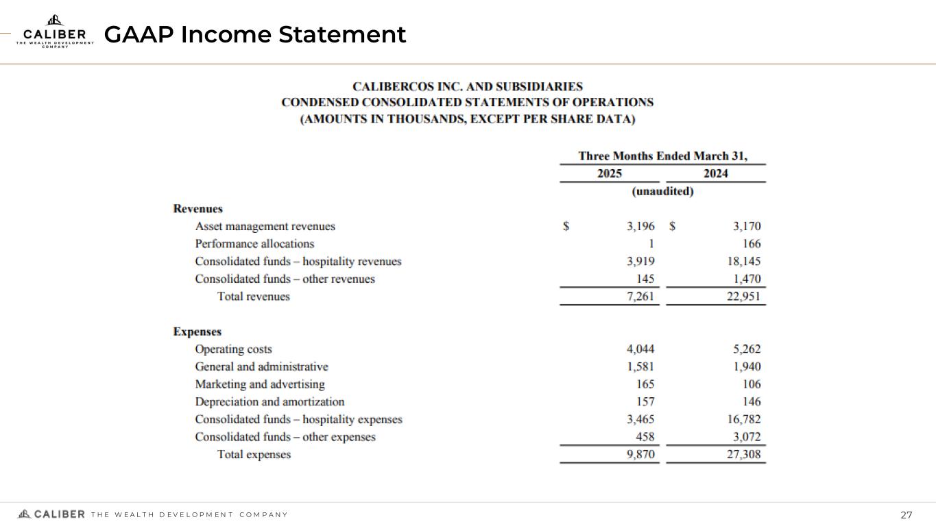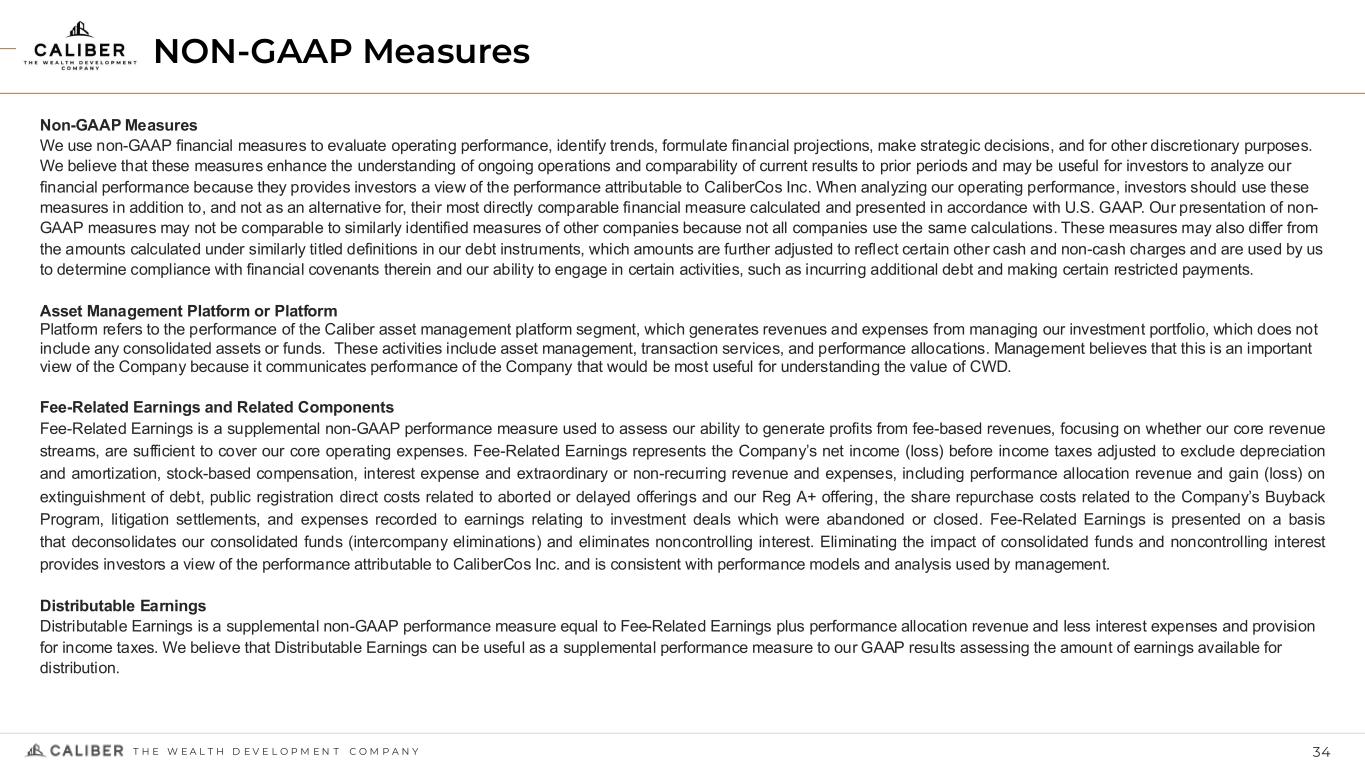 34T H E W E A L T H D E V E L O P M E N T C O M P A N Y Non-GAAP Measures We use non-GAAP financial measures to evaluate operating performance, identify trends, formulate financial projections, make strategic decisions, and for other discretionary purposes. We believe that these measures enhance the understanding of ongoing operations and comparability of current results to prior periods and may be useful for investors to analyze our financial performance because they provides investors a view of the performance attributable to CaliberCos Inc. When analyzing our operating performance, investors should use these measures in addition to, and not as an alternative for, their most directly comparable financial measure calculated and presented in accordance with U.S. GAAP. Our presentation of non- GAAP measures may not be comparable to similarly identified measures of other companies because not all companies use the same calculations. These measures may also differ from the amounts calculated under similarly titled definitions in our debt instruments, which amounts are further adjusted to reflect certain other cash and non-cash charges and are used by us to determine compliance with financial covenants therein and our ability to engage in certain activities, such as incurring additional debt and making certain restricted payments. Asset Management Platform or Platform Platform refers to the performance of the Caliber asset management platform segment, which generates revenues and expenses from managing our investment portfolio, which does not include any consolidated assets or funds. These activities include asset management, transaction services, and performance allocations. Management believes that this is an important view of the Company because it communicates performance of the Company that would be most useful for understanding the value of CWD. Fee-Related Earnings and Related Components Fee-Related Earnings is a supplemental non-GAAP performance measure used to assess our ability to generate profits from fee-based revenues, focusing on whether our core revenue streams, are sufficient to cover our core operating expenses. Fee-Related Earnings represents the Company’s net income (loss) before income taxes adjusted to exclude depreciation and amortization, stock-based compensation, interest expense and extraordinary or non-recurring revenue and expenses, including performance allocation revenue and gain (loss) on extinguishment of debt, public registration direct costs related to aborted or delayed offerings and our Reg A+ offering, the share repurchase costs related to the Company’s Buyback Program, litigation settlements, and expenses recorded to earnings relating to investment deals which were abandoned or closed. Fee-Related Earnings is presented on a basis that deconsolidates our consolidated funds (intercompany eliminations) and eliminates noncontrolling interest. Eliminating the impact of consolidated funds and noncontrolling interest provides investors a view of the performance attributable to CaliberCos Inc. and is consistent with performance models and analysis used by management. Distributable Earnings Distributable Earnings is a supplemental non-GAAP performance measure equal to Fee-Related Earnings plus performance allocation revenue and less interest expenses and provision for income taxes. We believe that Distributable Earnings can be useful as a supplemental performance measure to our GAAP results assessing the amount of earnings available for distribution. NON-GAAP Measures