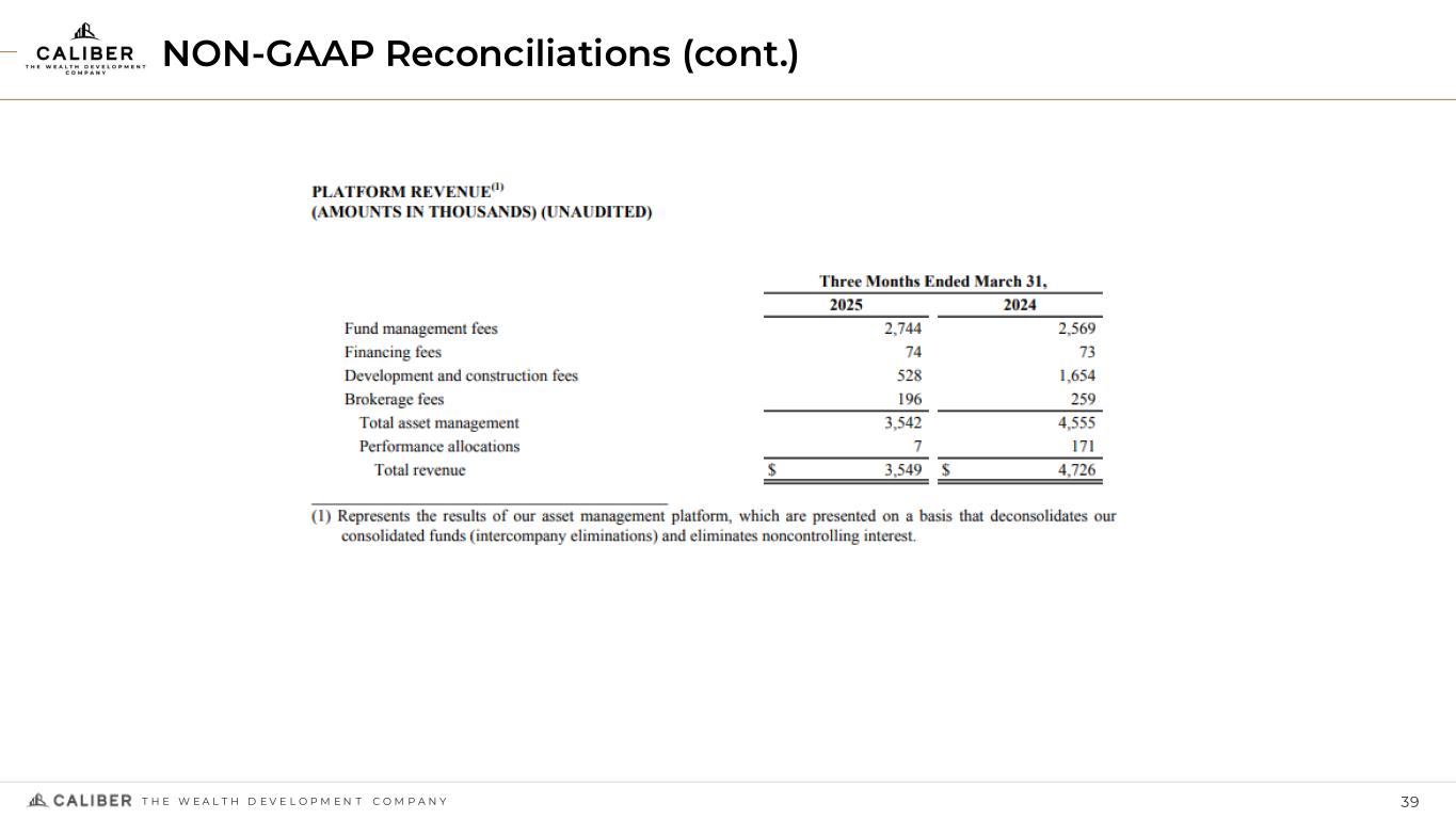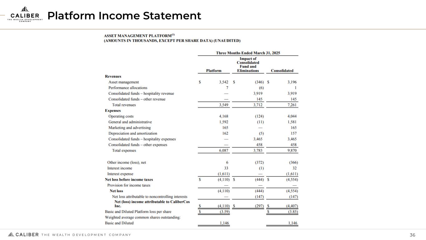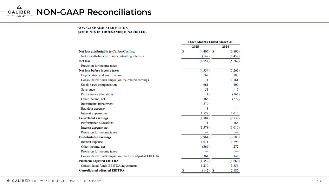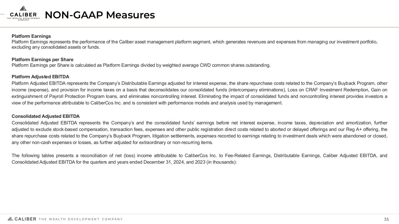 35T H E W E A L T H D E V E L O P M E N T C O M P A N Y Platform Earnings Platform Earnings represents the performance of the Caliber asset management platform segment, which generates revenues and expenses from managing our investment portfolio, excluding any consolidated assets or funds. Platform Earnings per Share Platform Earnings per Share is calculated as Platform Earnings divided by weighted average CWD common shares outstanding. Platform Adjusted EBITDA Platform Adjusted EBITDA represents the Company’s Distributable Earnings adjusted for interest expense, the share repurchase costs related to the Company’s Buyback Program, other income (expense), and provision for income taxes on a basis that deconsolidates our consolidated funds (intercompany eliminations), Loss on CRAF Investment Redemption, Gain on extinguishment of Payroll Protection Program loans, and eliminates noncontrolling interest. Eliminating the impact of consolidated funds and noncontrolling interest provides investors a view of the performance attributable to CaliberCos Inc. and is consistent with performance models and analysis used by management. Consolidated Adjusted EBITDA Consolidated Adjusted EBITDA represents the Company’s and the consolidated funds’ earnings before net interest expense, income taxes, depreciation and amortization, further adjusted to exclude stock-based compensation, transaction fees, expenses and other public registration direct costs related to aborted or delayed offerings and our Reg A+ offering, the share repurchase costs related to the Company’s Buyback Program, litigation settlements, expenses recorded to earnings relating to investment deals which were abandoned or closed, any other non-cash expenses or losses, as further adjusted for extraordinary or non-recurring items. The following tables presents a reconciliation of net (loss) income attributable to CaliberCos Inc. to Fee-Related Earnings, Distributable Earnings, Caliber Adjusted EBITDA, and Consolidated Adjusted EBITDA for the quarters and years ended December 31, 2024, and 2023 (in thousands): NON-GAAP Measures