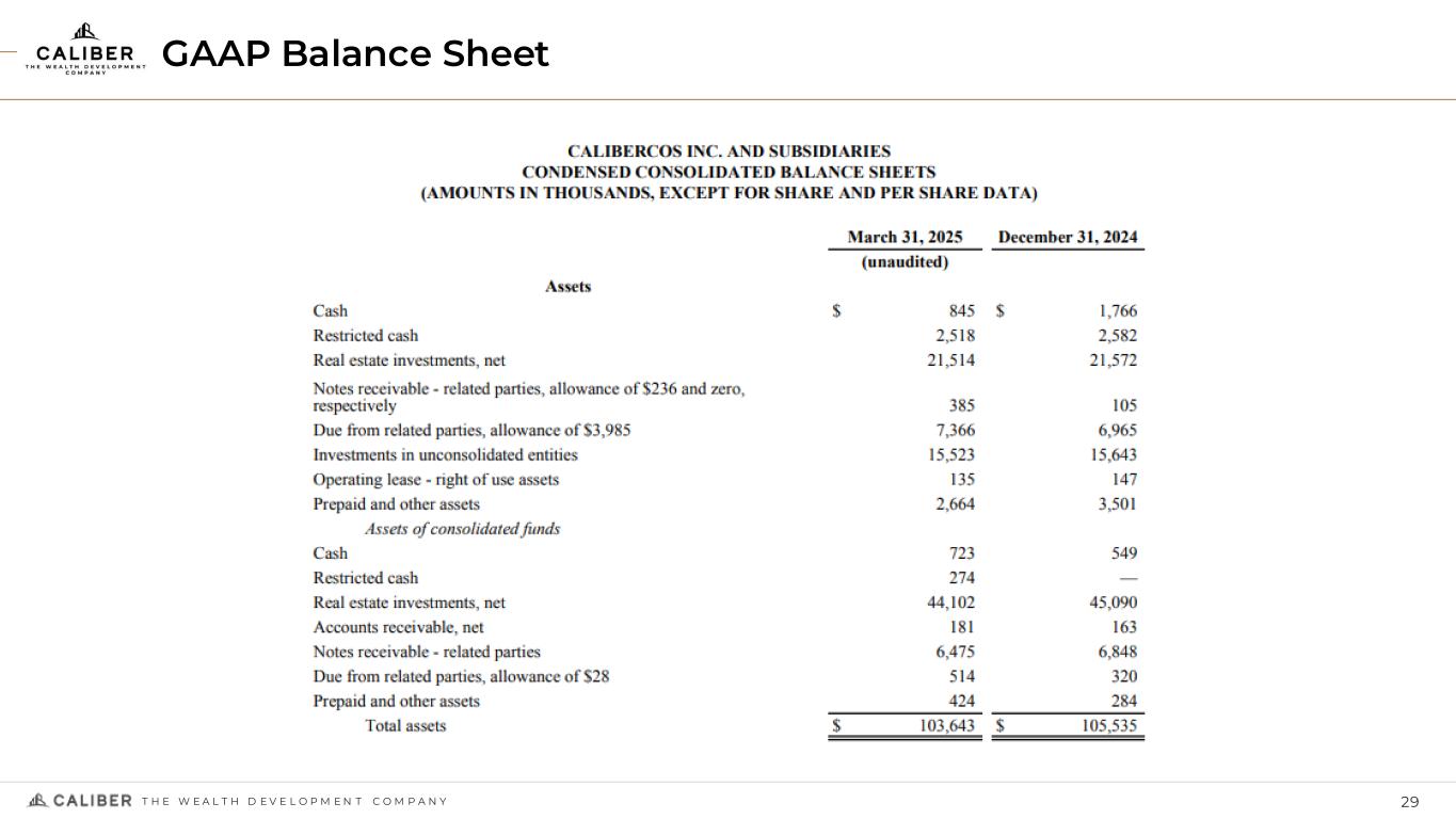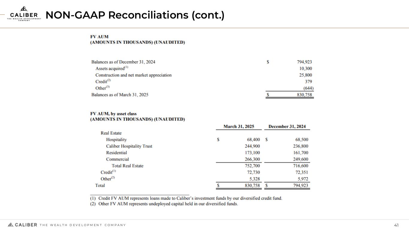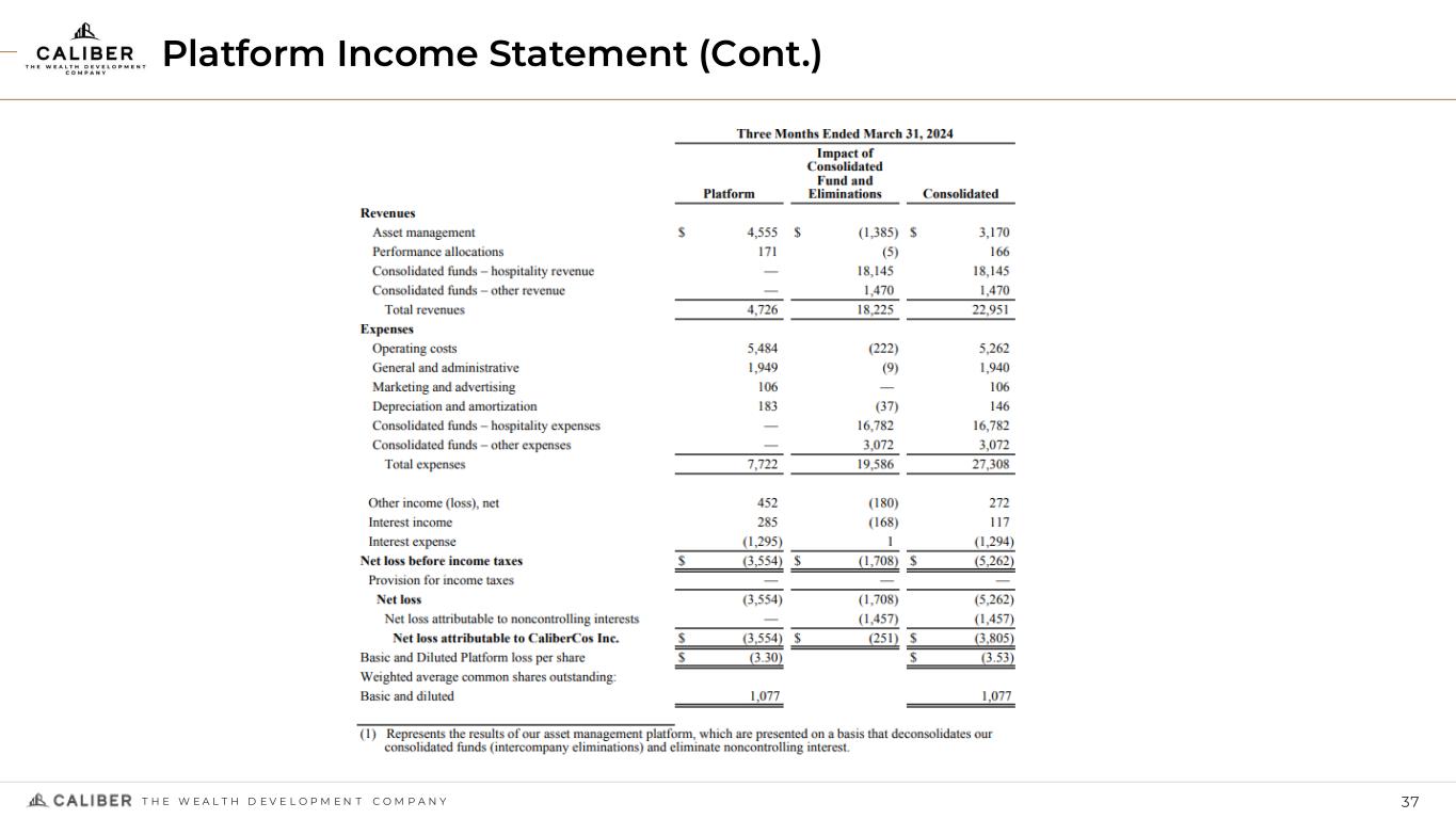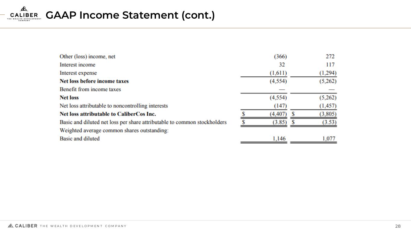 35T H E W E A L T H D E V E L O P M E N T C O M P A N Y Platform Earnings Platform Earnings represents the performance of the Caliber asset management platform segment, which generates revenues and expenses from managing our investment portfolio, excluding any consolidated assets or funds. Platform Earnings per Share Platform Earnings per Share is calculated as Platform Earnings divided by weighted average CWD common shares outstanding. Platform Adjusted EBITDA Platform Adjusted EBITDA represents the Company’s Distributable Earnings adjusted for interest expense, the share repurchase costs related to the Company’s Buyback Program, other income (expense), and provision for income taxes on a basis that deconsolidates our consolidated funds (intercompany eliminations), Loss on CRAF Investment Redemption, Gain on extinguishment of Payroll Protection Program loans, and eliminates noncontrolling interest. Eliminating the impact of consolidated funds and noncontrolling interest provides investors a view of the performance attributable to CaliberCos Inc. and is consistent with performance models and analysis used by management. Consolidated Adjusted EBITDA Consolidated Adjusted EBITDA represents the Company’s and the consolidated funds’ earnings before net interest expense, income taxes, depreciation and amortization, further adjusted to exclude stock-based compensation, transaction fees, expenses and other public registration direct costs related to aborted or delayed offerings and our Reg A+ offering, the share repurchase costs related to the Company’s Buyback Program, litigation settlements, expenses recorded to earnings relating to investment deals which were abandoned or closed, any other non-cash expenses or losses, as further adjusted for extraordinary or non-recurring items. The following tables presents a reconciliation of net (loss) income attributable to CaliberCos Inc. to Fee-Related Earnings, Distributable Earnings, Caliber Adjusted EBITDA, and Consolidated Adjusted EBITDA for the quarters and years ended December 31, 2024, and 2023 (in thousands): NON-GAAP Measures