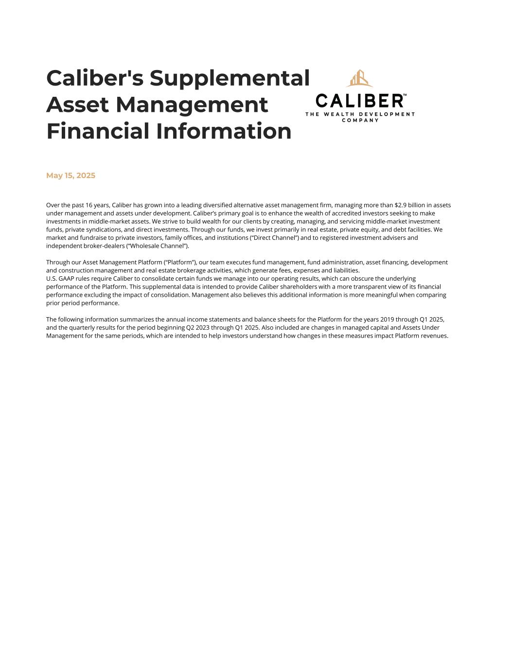 Over the past 16 years, Caliber has grown into a leading diversified alternative asset management firm, managing more than $2.9 billion in assets under management and assets under development. Caliber’s primary goal is to enhance the wealth of accredited investors seeking to make investments in middle-market assets. We strive to build wealth for our clients by creating, managing, and servicing middle-market investment funds, private syndications, and direct investments. Through our funds, we invest primarily in real estate, private equity, and debt facilities. We market and fundraise to private investors, family offices, and institutions (“Direct Channel”) and to registered investment advisers and independent broker-dealers (“Wholesale Channel”). Through our Asset Management Platform (“Platform”), our team executes fund management, fund administration, asset financing, development and construction management and real estate brokerage activities, which generate fees, expenses and liabilities. U.S. GAAP rules require Caliber to consolidate certain funds we manage into our operating results, which can obscure the underlying performance of the Platform. This supplemental data is intended to provide Caliber shareholders with a more transparent view of its financial performance excluding the impact of consolidation. Management also believes this additional information is more meaningful when comparing prior period performance. The following information summarizes the annual income statements and balance sheets for the Platform for the years 2019 through Q1 2025, and the quarterly results for the period beginning Q2 2023 through Q1 2025. Also included are changes in managed capital and Assets Under Management for the same periods, which are intended to help investors understand how changes in these measures impact Platform revenues. Caliber's Supplemental Asset Management Financial Information May 15, 2025