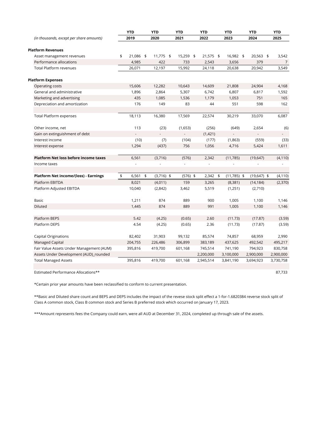YTD YTD YTD YTD YTD YTD YTD (in thousands, except per share amounts) 2019 2020 2021 2022 2023 2024 2025 Platform Revenues Asset management revenues 21,086$ 11,775$ 15,259$ 21,575$ 16,982$ 20,563$ 3,542$ Performance allocations 4,985 422 733 2,543 3,656 379 7 Total Platform revenues 26,071 12,197 15,992 24,118 20,638 20,942 3,549 Platform Expenses Operating costs 15,606 12,282 10,643 14,609 21,808 24,904 4,168 General and administrative 1,896 2,864 5,307 6,742 6,807 6,817 1,592 Marketing and advertising 435 1,085 1,536 1,179 1,053 751 165 Depreciation and amortization 176 149 83 44 551 598 162 Total Platform expenses 18,113 16,380 17,569 22,574 30,219 33,070 6,087 Other income, net 113 (23) (1,653) (256) (649) 2,654 (6) Gain on extinguishment of debt - - - (1,421) - - - Interest income (10) (7) (104) (177) (1,863) (559) (33) Interest expense 1,294 (437) 756 1,056 4,716 5,424 1,611 Platform Net loss before income taxes 6,561 (3,716) (576) 2,342 (11,785) (19,647) (4,110) Income taxes - - - - - - - Platform Net income/(loss) - Earnings 6,561$ (3,716)$ (576)$ 2,342$ (11,785)$ (19,647)$ (4,110)$ Platform EBITDA 8,021 (4,011) 159 3,265 (8,381) (14,184) (2,370) Platform Adjusted EBITDA 10,040 (2,842) 3,462 5,519 (1,251) (2,710) Basic 1,211 874 889 900 1,005 1,100 1,146 Diluted 1,445 874 889 991 1,005 1,100 1,146 Platform BEPS 5.42 (4.25) (0.65) 2.60 (11.73) (17.87) (3.59) Platform DEPS 4.54 (4.25) (0.65) 2.36 (11.73) (17.87) (3.59) Capital Originations 82,402 31,903 99,132 85,574 74,857 68,959 2,990 Managed Capital 204,755 226,486 306,899 383,189 437,625 492,542 495,217 Fair Value Assets Under Management (AUM) 395,816 419,700 601,168 745,514 741,190 794,923 830,758 Assets Under Development (AUD)_rounded 2,200,000 3,100,000 2,900,000 2,900,000 Total Managed Assets 395,816 419,700 601,168 2,945,514 3,841,190 3,694,923 3,730,758 Estimated Performance Allocations** 87,733 *Certain prior year amounts have been reclassified to conform to current presentation. ***Amount represents fees the Company could earn, were all AUD at December 31, 2024, completed up through sale of the assets. **Basic and Diluted share count and BEPS and DEPS includes the impact of the revese stock split effect a 1-for-1.6820384 reverse stock split of Class A common stock, Class B common stock and Series B preferred stock which occurred on January 17, 2023.
