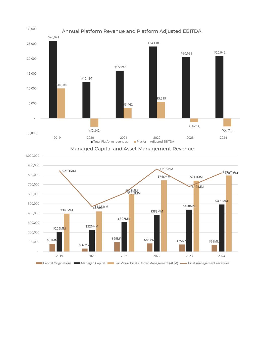 $26,071 $12,197 $15,992 $24,118 $20,638 $20,942 $10,040 $(2,842) $3,462 $5,519 $(1,251) $(2,710) (5,000) - 5,000 10,000 15,000 20,000 25,000 30,000 2019 2020 2021 2022 2023 2024 Annual Platform Revenue and Platform Adjusted EBITDA Total Platform revenues Platform Adjusted EBITDA $82MM $32MM $99MM $86MM $75MM $69MM $205MM $226MM $307MM $383MM $438MM $493MM $396MM $420MM $601MM $746MM $741MM $795MM$21.1MM $11.8MM $15.3MM $21.6MM $17.MM $20.6MM - 100,000 200,000 300,000 400,000 500,000 600,000 700,000 800,000 900,000 1,000,000 2019 2020 2021 2022 2023 2024 Managed Capital and Asset Management Revenue Capital Originations Managed Capital Fair Value Assets Under Management (AUM) Asset management revenues