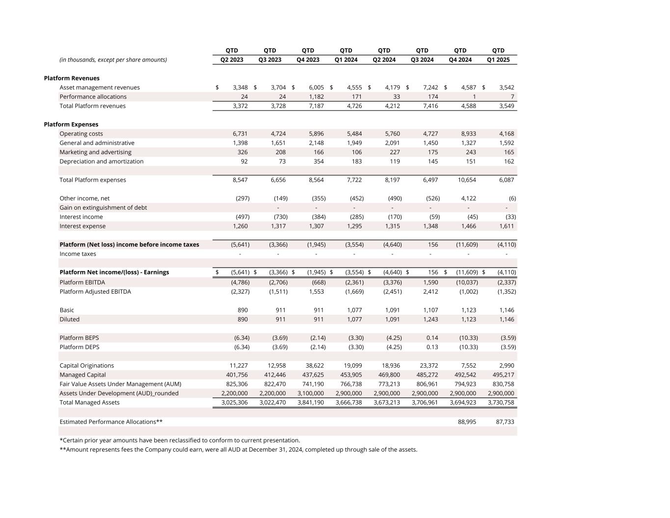 QTD QTD QTD QTD QTD QTD QTD QTD (in thousands, except per share amounts) Q2 2023 Q3 2023 Q4 2023 Q1 2024 Q2 2024 Q3 2024 Q4 2024 Q1 2025 Platform Revenues Asset management revenues 3,348$ 3,704$ 6,005$ 4,555$ 4,179$ 7,242$ 4,587$ 3,542$ Performance allocations 24 24 1,182 171 33 174 1 7 Total Platform revenues 3,372 3,728 7,187 4,726 4,212 7,416 4,588 3,549 Platform Expenses Operating costs 6,731 4,724 5,896 5,484 5,760 4,727 8,933 4,168 General and administrative 1,398 1,651 2,148 1,949 2,091 1,450 1,327 1,592 Marketing and advertising 326 208 166 106 227 175 243 165 Depreciation and amortization 92 73 354 183 119 145 151 162 Total Platform expenses 8,547 6,656 8,564 7,722 8,197 6,497 10,654 6,087 Other income, net (297) (149) (355) (452) (490) (526) 4,122 (6) Gain on extinguishment of debt - - - - - - - Interest income (497) (730) (384) (285) (170) (59) (45) (33) Interest expense 1,260 1,317 1,307 1,295 1,315 1,348 1,466 1,611 Platform (Net loss) income before income taxes (5,641) (3,366) (1,945) (3,554) (4,640) 156 (11,609) (4,110) Income taxes - - - - - - - - Platform Net income/(loss) - Earnings (5,641)$ (3,366)$ (1,945)$ (3,554)$ (4,640)$ 156$ (11,609)$ (4,110)$ Platform EBITDA (4,786) (2,706) (668) (2,361) (3,376) 1,590 (10,037) (2,337) Platform Adjusted EBITDA (2,327) (1,511) 1,553 (1,669) (2,451) 2,412 (1,002) (1,352) Basic 890 911 911 1,077 1,091 1,107 1,123 1,146 Diluted 890 911 911 1,077 1,091 1,243 1,123 1,146 Platform BEPS (6.34) (3.69) (2.14) (3.30) (4.25) 0.14 (10.33) (3.59) Platform DEPS (6.34) (3.69) (2.14) (3.30) (4.25) 0.13 (10.33) (3.59) Capital Originations 11,227 12,958 38,622 19,099 18,936 23,372 7,552 2,990 Managed Capital 401,756 412,446 437,625 453,905 469,800 485,272 492,542 495,217 Fair Value Assets Under Management (AUM) 825,306 822,470 741,190 766,738 773,213 806,961 794,923 830,758 Assets Under Development (AUD)_rounded 2,200,000 2,200,000 3,100,000 2,900,000 2,900,000 2,900,000 2,900,000 2,900,000 Total Managed Assets 3,025,306 3,022,470 3,841,190 3,666,738 3,673,213 3,706,961 3,694,923 3,730,758 Estimated Performance Allocations** 88,995 87,733 *Certain prior year amounts have been reclassified to conform to current presentation. **Amount represents fees the Company could earn, were all AUD at December 31, 2024, completed up through sale of the assets.
