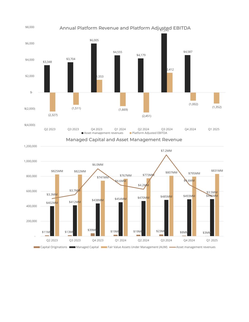 $3,348 $3,704 $6,005 $4,555 $4,179 $7,242 $4,587 (2,327) (1,511) 1,553 (1,669) (2,451) 2,412 (1,002) (1,352) $(4,000) $(2,000) $- $2,000 $4,000 $6,000 $8,000 Q2 2023 Q3 2023 Q4 2023 Q1 2024 Q2 2024 Q3 2024 Q4 2024 Q1 2025 Annual Platform Revenue and Platform Adjusted EBITDA Asset management revenues Platform Adjusted EBITDA $11MM $13MM $39MM $19MM $19MM $23MM $8MM $3MM $402MM $412MM $438MM $454MM $470MM $485MM $493MM $495MM $825MM $822MM $741MM $767MM $773MM $807MM $795MM $831MM $3.3MM $3.7MM $6.0MM $4.6MM $4.2MM $7.2MM $4.6MM $3.5MM - 200,000 400,000 600,000 800,000 1,000,000 1,200,000 Q2 2023 Q3 2023 Q4 2023 Q1 2024 Q2 2024 Q3 2024 Q4 2024 Q1 2025 Managed Capital and Asset Management Revenue Capital Originations Managed Capital Fair Value Assets Under Management (AUM) Asset management revenues