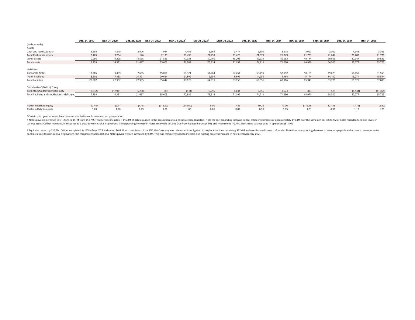 Dec. 31, 2019 Dec. 31, 2020 Dec. 31, 2021 Dec. 31, 2022 Mar. 31, 2023 1 Jun. 30, 2023 2 Sept. 30, 2023 Dec. 31, 2023 Mar. 31, 2024 Jun. 30, 2024 Sept. 30, 2024 Dec. 31, 2024 Mar. 31, 2025 (in thousands) Assets Cash and restricted cash 3,693 1,879 2,006 1,944 4,458 3,665 3,474 3,509 3,278 3,093 3,050 4,348 3,363 Total Real estate assets 3,105 3,284 126 2,133 21,493 21,453 21,425 21,571 21,749 21,733 21,644 21,782 21,776 Other assets 10,956 9,228 19,565 31,526 47,031 50,796 46,298 49,631 46,663 40,144 39,606 30,947 30,586 Total assets 17,755 14,391 21,697 35,603 72,982 75,914 71,197 74,711 71,690 64,970 64,300 57,077 55,725 Liabilities Corporate Notes 11,785 9,469 7,665 15,018 51,321 54,964 54,254 53,799 52,952 50,169 49,673 50,450 51,555 Other liabilities 18,202 17,833 20,321 20,624 21,802 9,955 8,899 14,256 15,164 15,174 14,102 15,071 15,534 Total liabilities 29,987 27,302 27,985 35,642 73,123 64,919 63,153 68,055 68,116 65,343 63,775 65,521 67,089 Stockholders’ (Deficit) Equity Total stockholders’ (deficit) equity (12,232) (12,911) (6,288) (39) (141) 10,995 8,044 6,656 3,574 (373) 525 (8,444) (11,364) Total liabilities and stockholders’ (deficit) eq 17,755 14,391 21,697 35,603 72,982 75,914 71,197 74,711 71,690 64,970 64,300 57,077 55,725 Platform Debt to equity (2.45) (2.11) (4.45) (913.90) (518.60) 5.90 7.85 10.22 19.06 (175.18) 121.48 (7.76) (5.90) Platform Debt to assets 1.69 1.90 1.29 1.00 1.00 0.86 0.89 0.91 0.95 1.01 0.99 1.15 1.20 *Certain prior year amounts have been reclassified to conform to current presentation. 1 Notes payable increased in Q1-2023 to $51M from $14.7M. This increase includes: i) $16.3M of debt assumed in the acquisition of our corporate headquarters. Note the corresponding increase in Real estate investments of approximately $19.4M over the same period. ii) $20.1M of notes raised to fund and invest in various assets Caliber managed. In response to a slow down in capital orginations. Corresponding increase in Notes receivable ($12m), Due from Related Parties ($4M), and investments ($2.4M). Remaining balance used in operations ($1.5M). 2 Equity increased by $16.7M. Caliber completed its IPO in May 2023 and raised $4M. Upon completion of the IPO, the Company was relieved of its obligation to buyback the then remaining $12.4M in shares from a former co-founder. Note the corresponding decrease to accounts payable and accrueds. In response to continues slowdown in capital originations, the company issued additional Notes payable which increased by $4M. This was completely used to invest in our existing projects (increase in notes receivable by $4M).