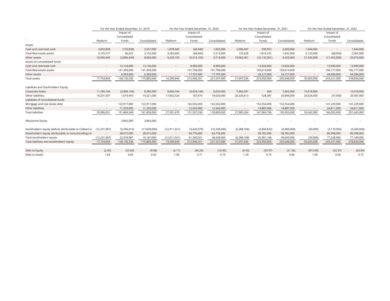 ` Platform Impact of Consolidated Funds Consolidated Platform Impact of Consolidated Funds Consolidated Platform Impact of Consolidated Funds Consolidated Platform Impact of Consolidated Funds Consolidated Assets Cash and restricted cash 3,692,838 (135,838) 3,557,000 1,878,940 (46,940) 1,832,000 2,006,047 599,953 2,606,000 1,944,000 - 1,944,000 Total Real estate assets 3,105,377 46,623 3,152,000 3,283,606 (68,606) 3,215,000 125,628 1,816,372 1,942,000 2,133,000 (68,000) 2,065,000 Other assets 10,956,449 (2,896,449) 8,060,000 9,228,103 (5,514,103) 3,714,000 19,565,361 (10,132,361) 9,433,000 31,526,000 (11,452,000) 20,074,000 Assets of consolidated funds Cash and restricted cash - 13,134,000 13,134,000 - 8,983,000 8,983,000 - 13,926,000 13,926,000 - 13,990,000 13,990,000 Total Real estate assets - 141,399,000 141,399,000 - 191,796,000 191,796,000 - 193,614,000 193,614,000 - 196,177,000 196,177,000 Other assets - 6,583,000 6,583,000 - 17,797,000 17,797,000 - 24,127,000 24,127,000 - 44,584,000 44,584,000 Total assets 17,754,664 158,130,336 175,885,000 14,390,649 212,946,351 227,337,000 21,697,036 223,950,964 245,648,000 35,603,000 243,231,000 278,834,000 Liabilities and Stockholders’ Equity Corporate Notes 11,785,144 (3,400,144) 8,385,000 9,469,144 (3,434,144) 6,035,000 7,664,591 409 7,665,000 15,018,000 - 15,018,000 Other liabilities 18,201,507 1,019,493 19,221,000 17,832,526 187,474 18,020,000 20,320,613 528,387 20,849,000 20,624,000 (37,000) 20,587,000 Liabilities of consolidated funds Mortgage and real estate debt - 122,917,000 122,917,000 - 142,502,000 142,502,000 - 152,554,000 152,554,000 - 141,229,000 141,229,000 Other liabilities - 11,333,000 11,333,000 - 12,342,000 12,342,000 - 14,887,000 14,887,000 - 24,811,000 24,811,000 Total liabilities 29,986,651 131,869,349 161,856,000 27,301,670 151,597,330 178,899,000 27,985,204 167,969,796 195,955,000 35,642,000 166,003,000 201,645,000 Mezzanine Equity - 3,842,000 3,842,000 - - - - - - - - - Stockholders’ equity (deficit) attributable to CaliberCos (12,231,987) (5,596,013) (17,828,000) (12,911,021) (3,426,979) (16,338,000) (6,288,168) (2,800,832) (9,089,000) (39,000) (3,170,000) (3,209,000) Stockholders’ equity attributable to noncontrolling inte - 28,015,000 28,015,000 - 64,776,000 64,776,000 - 58,782,000 58,782,000 - 80,398,000 80,398,000 Total stockholders’ equity (12,231,987) 22,418,987 10,187,000 (12,911,021) 61,349,021 48,438,000 (6,288,168) 55,981,168 49,693,000 (39,000) 77,228,000 77,189,000 Total liabilities and stockholders’ equity 17,754,664 158,130,336 175,885,000 14,390,649 212,946,351 227,337,000 21,697,036 223,950,964 245,648,000 35,603,000 243,231,000 278,834,000 Debt to Equity (2.45) (23.56) (9.08) (2.11) (44.24) (10.95) (4.45) (59.97) (21.56) (913.90) (52.37) (62.84) Debt to Assets 1.69 0.83 0.92 1.90 0.71 0.79 1.29 0.75 0.80 1.00 0.68 0.72 For the Year Ended December, 31, 2019 For the Year Ended December, 31, 2020 For the Year Ended December, 31, 2021 For the Year Ended December, 31, 2022