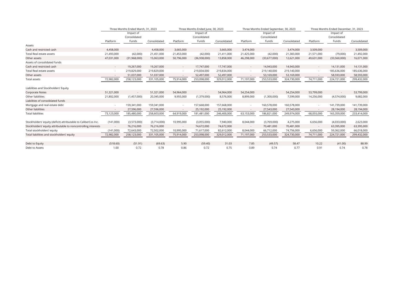 Platform Impact of Consolidated Funds Consolidated Platform Impact of Consolidated Funds Consolidated Platform Impact of Consolidated Funds Consolidated Platform Impact of Consolidated Funds Consolidated Assets Cash and restricted cash 4,458,000 - 4,458,000 3,665,000 - 3,665,000 3,474,000 - 3,474,000 3,509,000 - 3,509,000 Total Real estate assets 21,493,000 (42,000) 21,451,000 21,453,000 (42,000) 21,411,000 21,425,000 (42,000) 21,383,000 21,571,000 (79,000) 21,492,000 Other assets 47,031,000 (31,968,000) 15,063,000 50,796,000 (36,938,000) 13,858,000 46,298,000 (33,677,000) 12,621,000 49,631,000 (33,560,000) 16,071,000 Assets of consolidated funds Cash and restricted cash - 19,267,000 19,267,000 - 17,747,000 17,747,000 - 14,943,000 14,943,000 - 14,131,000 14,131,000 Total Real estate assets - 219,829,000 219,829,000 - 219,834,000 219,834,000 - 219,140,000 219,140,000 - 185,636,000 185,636,000 Other assets - 51,037,000 51,037,000 - 52,497,000 52,497,000 - 53,169,000 53,169,000 - 58,593,000 58,593,000 Total assets 72,982,000 258,123,000 331,105,000 75,914,000 253,098,000 329,012,000 71,197,000 253,533,000 324,730,000 74,711,000 224,721,000 299,432,000 Liabilities and Stockholders’ Equity Corporate Notes 51,321,000 - 51,321,000 54,964,000 - 54,964,000 54,254,000 - 54,254,000 53,799,000 - 53,799,000 Other liabilities 21,802,000 (1,457,000) 20,345,000 9,955,000 (1,379,000) 8,576,000 8,899,000 (1,300,000) 7,599,000 14,256,000 (4,574,000) 9,682,000 Liabilities of consolidated funds Mortgage and real estate debt - 159,341,000 159,341,000 - 157,668,000 157,668,000 - 160,578,000 160,578,000 - 141,739,000 141,739,000 Other liabilities - 27,596,000 27,596,000 - 25,192,000 25,192,000 - 27,543,000 27,543,000 - 28,194,000 28,194,000 Total liabilities 73,123,000 185,480,000 258,603,000 64,919,000 181,481,000 246,400,000 63,153,000 186,821,000 249,974,000 68,055,000 165,359,000 233,414,000 Stockholders’ equity (deficit) attributable to CaliberCos Inc. (141,000) (3,573,000) (3,714,000) 10,995,000 (3,055,000) 7,940,000 8,044,000 (3,769,000) 4,275,000 6,656,000 (4,033,000) 2,623,000 Stockholders’ equity attributable to noncontrolling interests - 76,216,000 76,216,000 - 74,672,000 74,672,000 - 70,481,000 70,481,000 - 63,395,000 63,395,000 Total stockholders’ equity (141,000) 72,643,000 72,502,000 10,995,000 71,617,000 82,612,000 8,044,000 66,712,000 74,756,000 6,656,000 59,362,000 66,018,000 Total liabilities and stockholders’ equity 72,982,000 258,123,000 331,105,000 75,914,000 253,098,000 329,012,000 71,197,000 253,533,000 324,730,000 74,711,000 224,721,000 299,432,000 Debt to Equity (518.60) (51.91) (69.63) 5.90 (59.40) 31.03 7.85 (49.57) 58.47 10.22 (41.00) 88.99 Debt to Assets 1.00 0.72 0.78 0.86 0.72 0.75 0.89 0.74 0.77 0.91 0.74 0.78 Three Months Ended March, 31, 2023 Three Months Ended June, 30, 2023 Three Months Ended September, 30, 2023 Three Months Ended December, 31, 2023