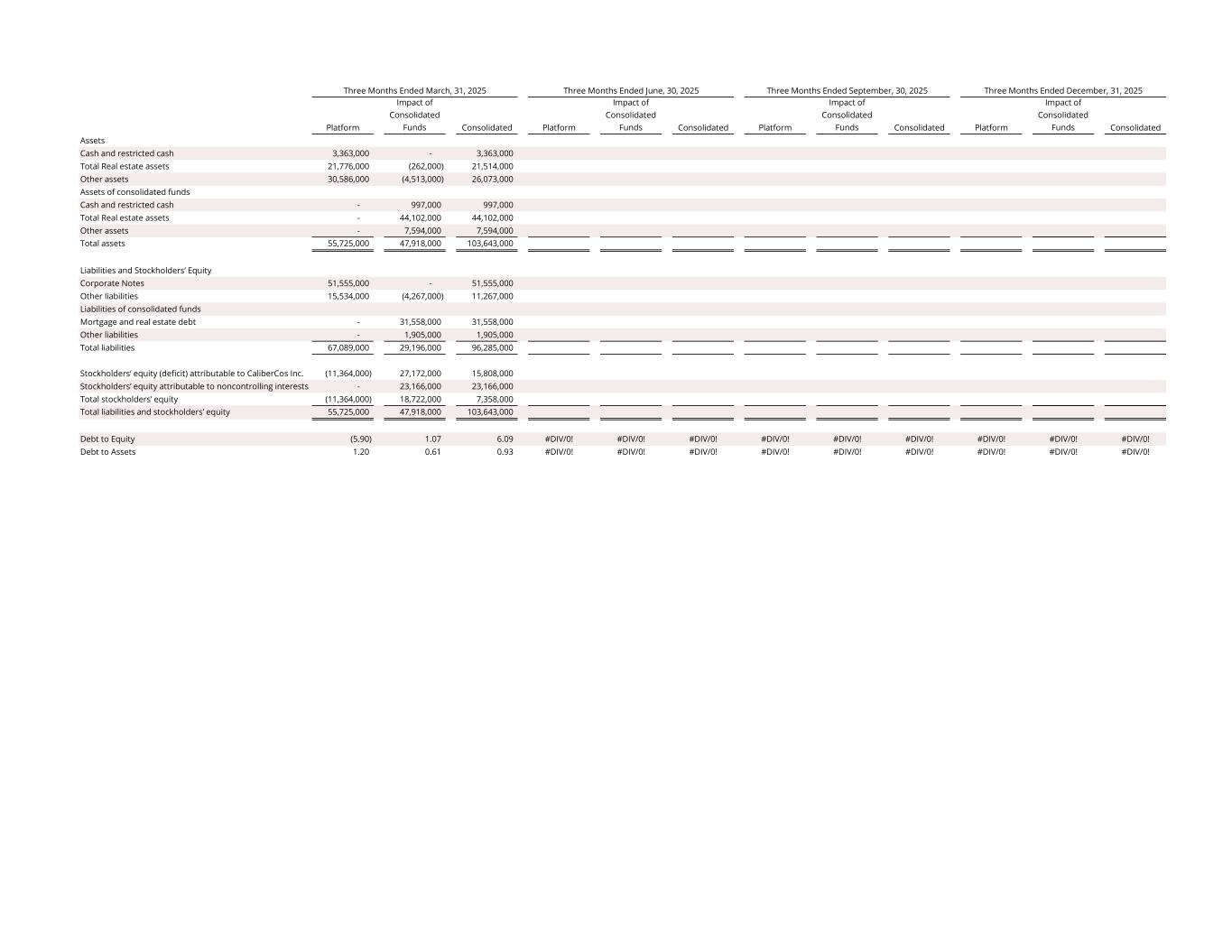 Platform Impact of Consolidated Funds Consolidated Platform Impact of Consolidated Funds Consolidated Platform Impact of Consolidated Funds Consolidated Platform Impact of Consolidated Funds Consolidated Assets Cash and restricted cash 3,363,000 - 3,363,000 Total Real estate assets 21,776,000 (262,000) 21,514,000 Other assets 30,586,000 (4,513,000) 26,073,000 Assets of consolidated funds Cash and restricted cash - 997,000 997,000 Total Real estate assets - 44,102,000 44,102,000 Other assets - 7,594,000 7,594,000 Total assets 55,725,000 47,918,000 103,643,000 Liabilities and Stockholders’ Equity Corporate Notes 51,555,000 - 51,555,000 Other liabilities 15,534,000 (4,267,000) 11,267,000 Liabilities of consolidated funds Mortgage and real estate debt - 31,558,000 31,558,000 Other liabilities - 1,905,000 1,905,000 Total liabilities 67,089,000 29,196,000 96,285,000 Stockholders’ equity (deficit) attributable to CaliberCos Inc. (11,364,000) 27,172,000 15,808,000 Stockholders’ equity attributable to noncontrolling interests - 23,166,000 23,166,000 Total stockholders’ equity (11,364,000) 18,722,000 7,358,000 Total liabilities and stockholders’ equity 55,725,000 47,918,000 103,643,000 Debt to Equity (5.90) 1.07 6.09 #DIV/0! #DIV/0! #DIV/0! #DIV/0! #DIV/0! #DIV/0! #DIV/0! #DIV/0! #DIV/0! Debt to Assets 1.20 0.61 0.93 #DIV/0! #DIV/0! #DIV/0! #DIV/0! #DIV/0! #DIV/0! #DIV/0! #DIV/0! #DIV/0! Three Months Ended March, 31, 2025 Three Months Ended June, 30, 2025 Three Months Ended September, 30, 2025 Three Months Ended December, 31, 2025