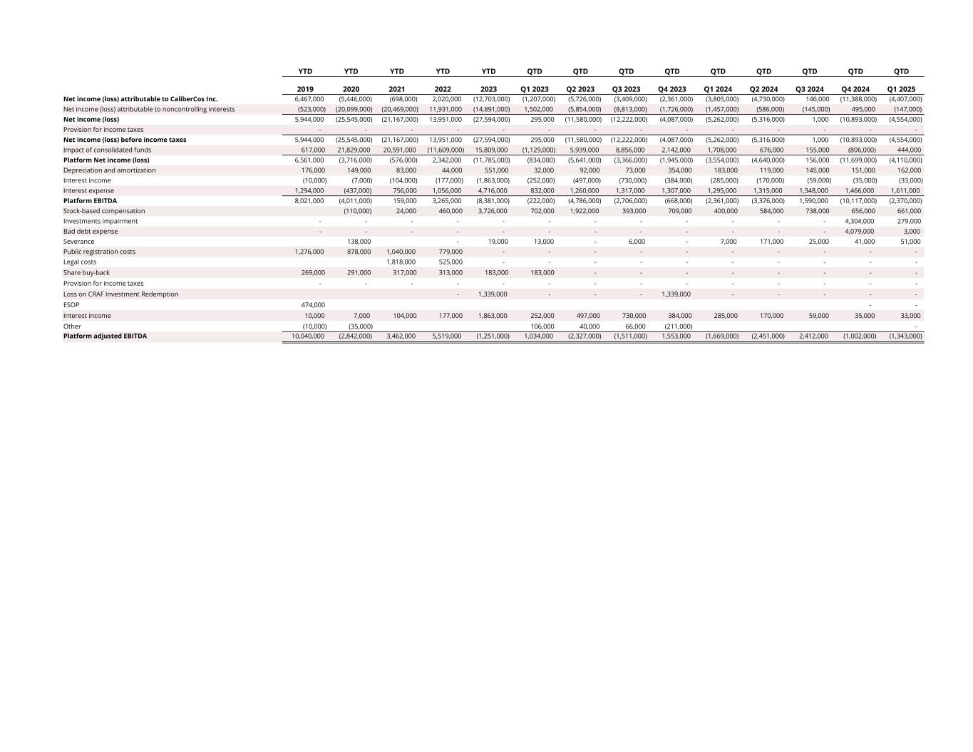 YTD YTD YTD YTD YTD QTD QTD QTD QTD QTD QTD QTD QTD QTD 2019 2020 2021 2022 2023 Q1 2023 Q2 2023 Q3 2023 Q4 2023 Q1 2024 Q2 2024 Q3 2024 Q4 2024 Q1 2025 Net income (loss) attributable to CaliberCos Inc. 6,467,000 (5,446,000) (698,000) 2,020,000 (12,703,000) (1,207,000) (5,726,000) (3,409,000) (2,361,000) (3,805,000) (4,730,000) 146,000 (11,388,000) (4,407,000) Net income (loss) attributable to noncontrolling interests (523,000) (20,099,000) (20,469,000) 11,931,000 (14,891,000) 1,502,000 (5,854,000) (8,813,000) (1,726,000) (1,457,000) (586,000) (145,000) 495,000 (147,000) Net income (loss) 5,944,000 (25,545,000) (21,167,000) 13,951,000 (27,594,000) 295,000 (11,580,000) (12,222,000) (4,087,000) (5,262,000) (5,316,000) 1,000 (10,893,000) (4,554,000) Provision for income taxes - - - - - - - - - - - - - - Net income (loss) before income taxes 5,944,000 (25,545,000) (21,167,000) 13,951,000 (27,594,000) 295,000 (11,580,000) (12,222,000) (4,087,000) (5,262,000) (5,316,000) 1,000 (10,893,000) (4,554,000) Impact of consolidated funds 617,000 21,829,000 20,591,000 (11,609,000) 15,809,000 (1,129,000) 5,939,000 8,856,000 2,142,000 1,708,000 676,000 155,000 (806,000) 444,000 Platform Net income (loss) 6,561,000 (3,716,000) (576,000) 2,342,000 (11,785,000) (834,000) (5,641,000) (3,366,000) (1,945,000) (3,554,000) (4,640,000) 156,000 (11,699,000) (4,110,000) Depreciation and amortization 176,000 149,000 83,000 44,000 551,000 32,000 92,000 73,000 354,000 183,000 119,000 145,000 151,000 162,000 Interest income (10,000) (7,000) (104,000) (177,000) (1,863,000) (252,000) (497,000) (730,000) (384,000) (285,000) (170,000) (59,000) (35,000) (33,000) Interest expense 1,294,000 (437,000) 756,000 1,056,000 4,716,000 832,000 1,260,000 1,317,000 1,307,000 1,295,000 1,315,000 1,348,000 1,466,000 1,611,000 Platform EBITDA 8,021,000 (4,011,000) 159,000 3,265,000 (8,381,000) (222,000) (4,786,000) (2,706,000) (668,000) (2,361,000) (3,376,000) 1,590,000 (10,117,000) (2,370,000) Stock-based compensation (110,000) 24,000 460,000 3,726,000 702,000 1,922,000 393,000 709,000 400,000 584,000 738,000 656,000 661,000 Investments impairment - - - - - - - - - - - - 4,304,000 279,000 Bad debt expense - - - - - - - - - - - - 4,079,000 3,000 Severance 138,000 - 19,000 13,000 - 6,000 - 7,000 171,000 25,000 41,000 51,000 Public registration costs 1,276,000 878,000 1,040,000 779,000 - - - - - - - - - - Legal costs 1,818,000 525,000 - - - - - - - - - - Share buy-back 269,000 291,000 317,000 313,000 183,000 183,000 - - - - - - - - Provision for income taxes - - - - - - - - - - - - - - Loss on CRAF Investment Redemption - 1,339,000 - - - 1,339,000 - - - - - ESOP 474,000 - - Interest income 10,000 7,000 104,000 177,000 1,863,000 252,000 497,000 730,000 384,000 285,000 170,000 59,000 35,000 33,000 Other (10,000) (35,000) 106,000 40,000 66,000 (211,000) - Platform adjusted EBITDA 10,040,000 (2,842,000) 3,462,000 5,519,000 (1,251,000) 1,034,000 (2,327,000) (1,511,000) 1,553,000 (1,669,000) (2,451,000) 2,412,000 (1,002,000) (1,343,000)
