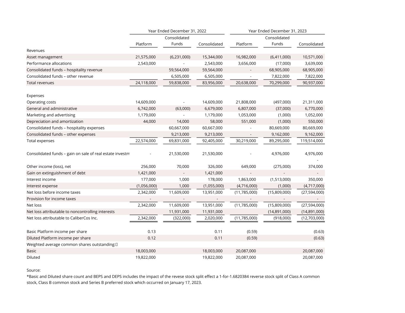 Platform Consolidated Funds Consolidated Platform Consolidated Funds Consolidated Revenues Asset management 21,575,000 (6,231,000) 15,344,000 16,982,000 (6,411,000) 10,571,000 Performance allocations 2,543,000 - 2,543,000 3,656,000 (17,000) 3,639,000 Consolidated funds – hospitality revenue 59,564,000 59,564,000 - 68,905,000 68,905,000 Consolidated funds – other revenue 6,505,000 6,505,000 - 7,822,000 7,822,000 Total revenues 24,118,000 59,838,000 83,956,000 20,638,000 70,299,000 90,937,000 Expenses Operating costs 14,609,000 - 14,609,000 21,808,000 (497,000) 21,311,000 General and administrative 6,742,000 (63,000) 6,679,000 6,807,000 (37,000) 6,770,000 Marketing and advertising 1,179,000 - 1,179,000 1,053,000 (1,000) 1,052,000 Depreciation and amortization 44,000 14,000 58,000 551,000 (1,000) 550,000 Consolidated funds – hospitality expenses 60,667,000 60,667,000 - 80,669,000 80,669,000 Consolidated funds – other expenses 9,213,000 9,213,000 - 9,162,000 9,162,000 Total expenses 22,574,000 69,831,000 92,405,000 30,219,000 89,295,000 119,514,000 Consolidated funds – gain on sale of real estate investm - 21,530,000 21,530,000 - 4,976,000 4,976,000 - Other income (loss), net 256,000 70,000 326,000 649,000 (275,000) 374,000 Gain on extinguishment of debt 1,421,000 - 1,421,000 - - - Interest income 177,000 1,000 178,000 1,863,000 (1,513,000) 350,000 Interest expense (1,056,000) 1,000 (1,055,000) (4,716,000) (1,000) (4,717,000) Net loss before income taxes 2,342,000 11,609,000 13,951,000 (11,785,000) (15,809,000) (27,594,000) Provision for income taxes - - - - - - Net loss 2,342,000 11,609,000 13,951,000 (11,785,000) (15,809,000) (27,594,000) Net loss attributable to noncontrolling interests 11,931,000 11,931,000 (14,891,000) (14,891,000) Net loss attributable to CaliberCos Inc. 2,342,000 (322,000) 2,020,000 (11,785,000) (918,000) (12,703,000) Basic Platform income per share 0.13 0.11 (0.59) (0.63) Diluted Platform income per share 0.12 0.11 (0.59) (0.63) Weighted average common shares outstanding: Basic 18,003,000 18,003,000 20,087,000 20,087,000 Diluted 19,822,000 19,822,000 20,087,000 20,087,000 Source: Year Ended December 31, 2022 Year Ended December 31, 2023 *Basic and Diluted share count and BEPS and DEPS includes the impact of the revese stock split effect a 1-for-1.6820384 reverse stock split of Class A common stock, Class B common stock and Series B preferred stock which occurred on January 17, 2023.