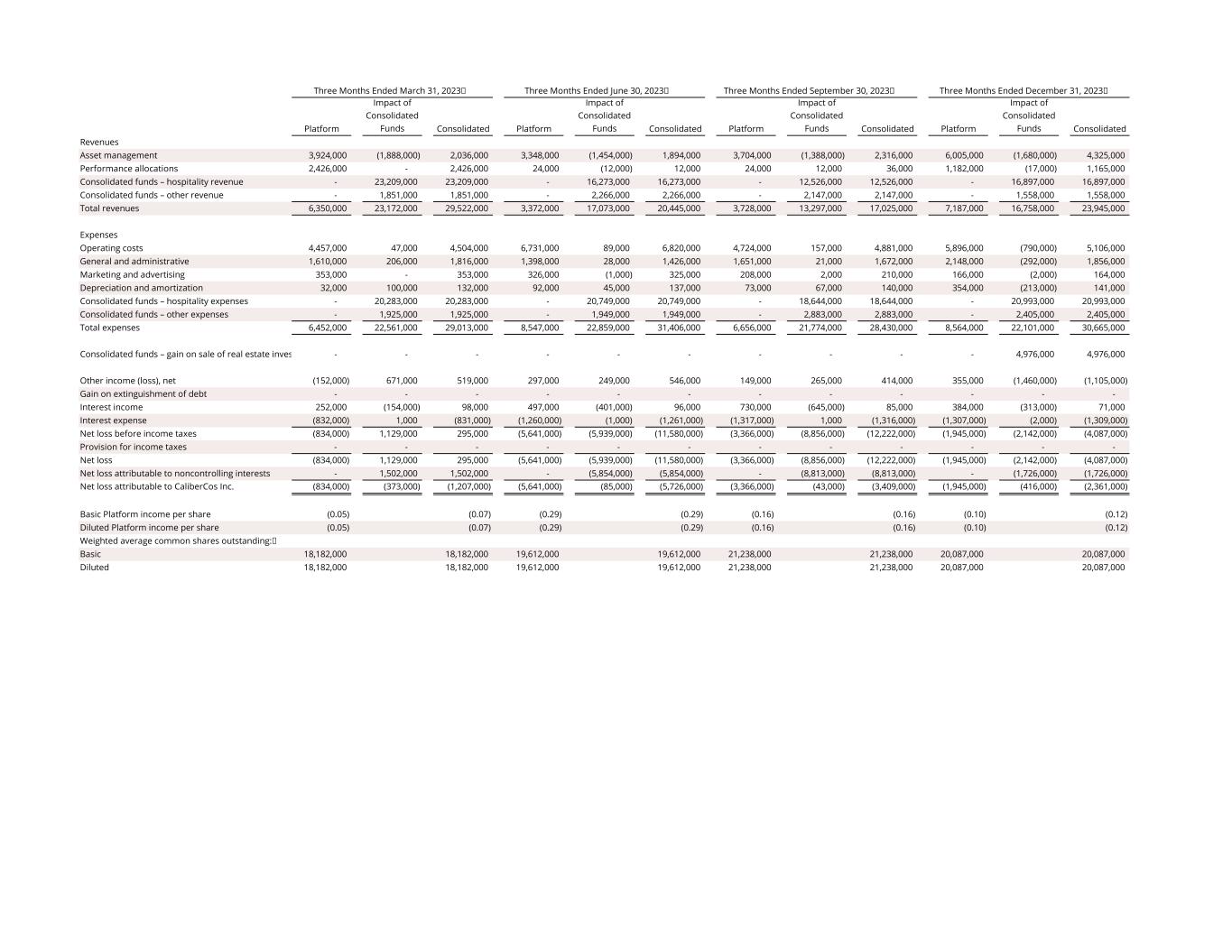 Platform Impact of Consolidated Funds Consolidated Platform Impact of Consolidated Funds Consolidated Platform Impact of Consolidated Funds Consolidated Platform Impact of Consolidated Funds Consolidated Revenues Asset management 3,924,000 (1,888,000) 2,036,000 3,348,000 (1,454,000) 1,894,000 3,704,000 (1,388,000) 2,316,000 6,005,000 (1,680,000) 4,325,000 Performance allocations 2,426,000 - 2,426,000 24,000 (12,000) 12,000 24,000 12,000 36,000 1,182,000 (17,000) 1,165,000 Consolidated funds – hospitality revenue - 23,209,000 23,209,000 - 16,273,000 16,273,000 - 12,526,000 12,526,000 - 16,897,000 16,897,000 Consolidated funds – other revenue - 1,851,000 1,851,000 - 2,266,000 2,266,000 - 2,147,000 2,147,000 - 1,558,000 1,558,000 Total revenues 6,350,000 23,172,000 29,522,000 3,372,000 17,073,000 20,445,000 3,728,000 13,297,000 17,025,000 7,187,000 16,758,000 23,945,000 Expenses Operating costs 4,457,000 47,000 4,504,000 6,731,000 89,000 6,820,000 4,724,000 157,000 4,881,000 5,896,000 (790,000) 5,106,000 General and administrative 1,610,000 206,000 1,816,000 1,398,000 28,000 1,426,000 1,651,000 21,000 1,672,000 2,148,000 (292,000) 1,856,000 Marketing and advertising 353,000 - 353,000 326,000 (1,000) 325,000 208,000 2,000 210,000 166,000 (2,000) 164,000 Depreciation and amortization 32,000 100,000 132,000 92,000 45,000 137,000 73,000 67,000 140,000 354,000 (213,000) 141,000 Consolidated funds – hospitality expenses - 20,283,000 20,283,000 - 20,749,000 20,749,000 - 18,644,000 18,644,000 - 20,993,000 20,993,000 Consolidated funds – other expenses - 1,925,000 1,925,000 - 1,949,000 1,949,000 - 2,883,000 2,883,000 - 2,405,000 2,405,000 Total expenses 6,452,000 22,561,000 29,013,000 8,547,000 22,859,000 31,406,000 6,656,000 21,774,000 28,430,000 8,564,000 22,101,000 30,665,000 Consolidated funds – gain on sale of real estate inves - - - - - - - - - - 4,976,000 4,976,000 Other income (loss), net (152,000) 671,000 519,000 297,000 249,000 546,000 149,000 265,000 414,000 355,000 (1,460,000) (1,105,000) Gain on extinguishment of debt - - - - - - - - - - - - Interest income 252,000 (154,000) 98,000 497,000 (401,000) 96,000 730,000 (645,000) 85,000 384,000 (313,000) 71,000 Interest expense (832,000) 1,000 (831,000) (1,260,000) (1,000) (1,261,000) (1,317,000) 1,000 (1,316,000) (1,307,000) (2,000) (1,309,000) Net loss before income taxes (834,000) 1,129,000 295,000 (5,641,000) (5,939,000) (11,580,000) (3,366,000) (8,856,000) (12,222,000) (1,945,000) (2,142,000) (4,087,000) Provision for income taxes - - - - - - - - - - - - Net loss (834,000) 1,129,000 295,000 (5,641,000) (5,939,000) (11,580,000) (3,366,000) (8,856,000) (12,222,000) (1,945,000) (2,142,000) (4,087,000) Net loss attributable to noncontrolling interests - 1,502,000 1,502,000 - (5,854,000) (5,854,000) - (8,813,000) (8,813,000) - (1,726,000) (1,726,000) Net loss attributable to CaliberCos Inc. (834,000) (373,000) (1,207,000) (5,641,000) (85,000) (5,726,000) (3,366,000) (43,000) (3,409,000) (1,945,000) (416,000) (2,361,000) Basic Platform income per share (0.05) (0.07) (0.29) (0.29) (0.16) (0.16) (0.10) (0.12) Diluted Platform income per share (0.05) (0.07) (0.29) (0.29) (0.16) (0.16) (0.10) (0.12) Weighted average common shares outstanding: Basic 18,182,000 18,182,000 19,612,000 19,612,000 21,238,000 21,238,000 20,087,000 20,087,000 Diluted 18,182,000 18,182,000 19,612,000 19,612,000 21,238,000 21,238,000 20,087,000 20,087,000 Three Months Ended March 31, 2023 Three Months Ended June 30, 2023 Three Months Ended September 30, 2023 Three Months Ended December 31, 2023