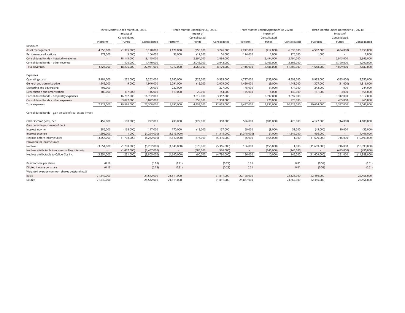 Platform Impact of Consolidated Funds Consolidated Platform Impact of Consolidated Funds Consolidated Platform Impact of Consolidated Funds Consolidated Platform Impact of Consolidated Funds Consolidated Revenues Asset management 4,555,000 (1,385,000) 3,170,000 4,179,000 (953,000) 3,226,000 7,242,000 (712,000) 6,530,000 4,587,000 (634,000) 3,953,000 Performance allocations 171,000 (5,000) 166,000 33,000 (17,000) 16,000 174,000 1,000 175,000 1,000 - 1,000 Consolidated funds – hospitality revenue - 18,145,000 18,145,000 - 2,894,000 2,894,000 - 2,494,000 2,494,000 - 2,943,000 2,943,000 Consolidated funds – other revenue - 1,470,000 1,470,000 - 2,043,000 2,043,000 - 2,103,000 2,103,000 - 1,790,000 1,790,000 Total revenues 4,726,000 18,225,000 22,951,000 4,212,000 3,967,000 8,179,000 7,416,000 3,886,000 11,302,000 4,588,000 4,099,000 8,687,000 Expenses Operating costs 5,484,000 (222,000) 5,262,000 5,760,000 (225,000) 5,535,000 4,727,000 (135,000) 4,592,000 8,933,000 (383,000) 8,550,000 General and administrative 1,949,000 (9,000) 1,940,000 2,091,000 (12,000) 2,079,000 1,450,000 (9,000) 1,441,000 1,327,000 (11,000) 1,316,000 Marketing and advertising 106,000 - 106,000 227,000 - 227,000 175,000 (1,000) 174,000 243,000 1,000 244,000 Depreciation and amortization 183,000 (37,000) 146,000 119,000 25,000 144,000 145,000 4,000 149,000 151,000 3,000 154,000 Consolidated funds – hospitality expenses - 16,782,000 16,782,000 - 3,312,000 3,312,000 - 3,097,000 3,097,000 - 3,312,000 3,312,000 Consolidated funds – other expenses - 3,072,000 3,072,000 - 1,358,000 1,358,000 - 975,000 975,000 - 465,000 465,000 Total expenses 7,722,000 19,586,000 27,308,000 8,197,000 4,458,000 12,655,000 6,497,000 3,931,000 10,428,000 10,654,000 3,387,000 14,041,000 Consolidated funds – gain on sale of real estate investm - - - - - - - - - - - - Other income (loss), net 452,000 (180,000) 272,000 490,000 (172,000) 318,000 526,000 (101,000) 425,000 4,122,000 (14,000) 4,108,000 Gain on extinguishment of debt - - - - - - - - - - - - Interest income 285,000 (168,000) 117,000 170,000 (13,000) 157,000 59,000 (8,000) 51,000 (45,000) 10,000 (35,000) Interest expense (1,295,000) 1,000 (1,294,000) (1,315,000) - (1,315,000) (1,348,000) (1,000) (1,349,000) 1,466,000 - 1,466,000 Net loss before income taxes (3,554,000) (1,708,000) (5,262,000) (4,640,000) (676,000) (5,316,000) 156,000 (155,000) 1,000 (11,609,000) 716,000 (10,893,000) Provision for income taxes - - - - - - - - - - - - Net loss (3,554,000) (1,708,000) (5,262,000) (4,640,000) (676,000) (5,316,000) 156,000 (155,000) 1,000 (11,609,000) 716,000 (10,893,000) Net loss attributable to noncontrolling interests - (1,457,000) (1,457,000) - (586,000) (586,000) - (145,000) (145,000) - (495,000) (495,000) Net loss attributable to CaliberCos Inc. (3,554,000) (251,000) (3,805,000) (4,640,000) (90,000) (4,730,000) 156,000 (10,000) 146,000 (11,609,000) 221,000 (11,388,000) Basic income per share (0.16) (0.18) (0.21) (0.22) 0.01 0.01 (0.52) (0.51) Diluted income per share (0.16) (0.18) (0.21) (0.22) 0.01 0.01 (0.52) (0.51) Weighted average common shares outstanding: Basic 21,542,000 21,542,000 21,811,000 21,811,000 22,128,000 22,128,000 22,456,000 22,456,000 Diluted 21,542,000 21,542,000 21,811,000 21,811,000 24,867,000 24,867,000 22,456,000 22,456,000 Three Months Ended March 31, 2024 Three Months Ended June 30, 2024 Three Months Ended December 31, 2024 Three Months Ended September 30, 2024