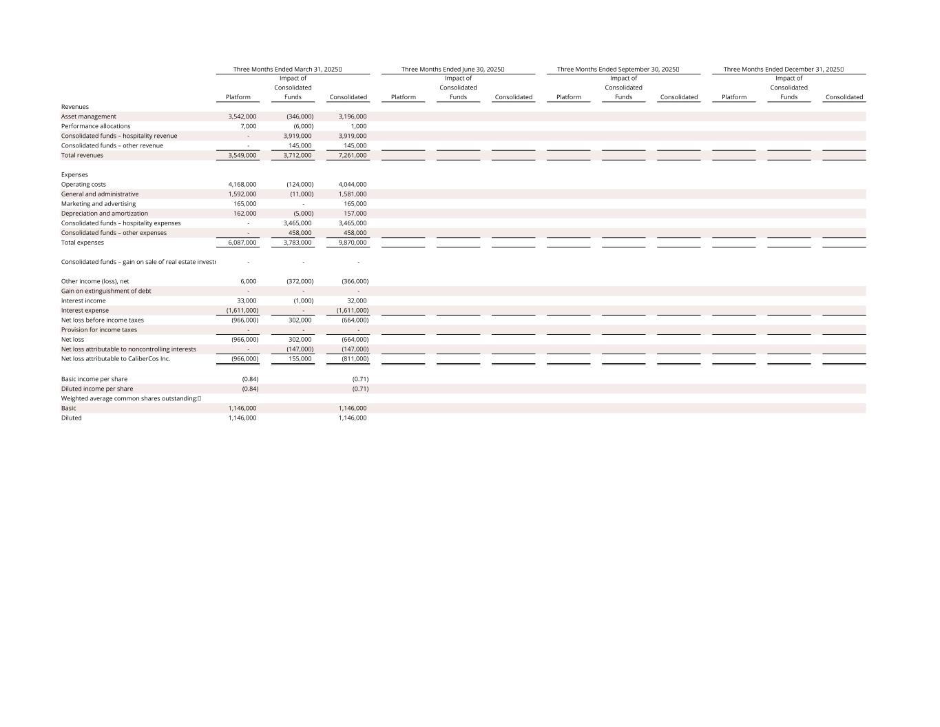Platform Impact of Consolidated Funds Consolidated Platform Impact of Consolidated Funds Consolidated Platform Impact of Consolidated Funds Consolidated Platform Impact of Consolidated Funds Consolidated Revenues Asset management 3,542,000 (346,000) 3,196,000 Performance allocations 7,000 (6,000) 1,000 Consolidated funds – hospitality revenue - 3,919,000 3,919,000 Consolidated funds – other revenue - 145,000 145,000 Total revenues 3,549,000 3,712,000 7,261,000 Expenses Operating costs 4,168,000 (124,000) 4,044,000 General and administrative 1,592,000 (11,000) 1,581,000 Marketing and advertising 165,000 - 165,000 Depreciation and amortization 162,000 (5,000) 157,000 Consolidated funds – hospitality expenses - 3,465,000 3,465,000 Consolidated funds – other expenses - 458,000 458,000 Total expenses 6,087,000 3,783,000 9,870,000 Consolidated funds – gain on sale of real estate investm - - - Other income (loss), net 6,000 (372,000) (366,000) Gain on extinguishment of debt - - - Interest income 33,000 (1,000) 32,000 Interest expense (1,611,000) - (1,611,000) Net loss before income taxes (966,000) 302,000 (664,000) Provision for income taxes - - - Net loss (966,000) 302,000 (664,000) Net loss attributable to noncontrolling interests - (147,000) (147,000) Net loss attributable to CaliberCos Inc. (966,000) 155,000 (811,000) Basic income per share (0.84) (0.71) Diluted income per share (0.84) (0.71) Weighted average common shares outstanding: Basic 1,146,000 1,146,000 Diluted 1,146,000 1,146,000 Three Months Ended March 31, 2025 Three Months Ended June 30, 2025 Three Months Ended September 30, 2025 Three Months Ended December 31, 2025