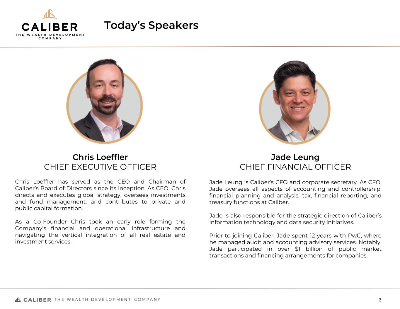 Disclaimers Forward-Looking Statements This presentation includes statements concerning CaliberCos Inc.’s (the “Company,” or “Caliber”) expectations, beliefs, plans, objectives, goals, strategies, assumptions of future events, future financial performance, or growth and other statements that are not historical facts.  These statements are "forward- looking statements" within the meaning of the Private Securities Litigation Reform Act of 1995. In some cases, readers and the audience can identify these forward-looking statements through the use of words or phrases such as "estimate,“ "expect," "anticipate," "intend," "plan," "project," "believe," "forecast," "should," "could," and other similar expressions.  Forward-looking statements involve risks and uncertainties that may cause actual results or outcomes to differ materially from those included in the forward-looking statements. The Company's expectations, beliefs, and projections are expressed in good faith and are believed by the Company to have a reasonable basis, but there can be no assurance that management's expectations, beliefs, or projections will be achieved or accomplished. Factors that may cause actual results to differ materially from those included in the forward-looking statements include, but are not limited to, factors affecting the Company’s ability to successfully operate and manage its business, including, among others, title disputes, weather conditions, shortages, delays, or unavailability of equipment and services, property management, brokerage, investment and fund operations, the need to obtain governmental approvals and permits, and compliance with environmental laws and regulations; changes in costs of operations; loss of markets; volatility of asset prices; imprecision of asset valuations; environmental risks; competition; inability to access sufficient capital; general economic conditions; litigation; changes in regulation and legislation; economic disruptions or uninsured losses resulting from major accidents, fires, severe weather, natural disasters, terrorist activities, acts of war, cyber attacks, or pest infestation; increasing costs of insurance, changes in coverage and the ability to obtain insurance; and other presently unknown or unforeseen factors. Other risk factors are detailed from time to time in the Company's reports filed with the Securities and Exchange Commission. Any forward-looking statement speaks only as of the date on which such statement is made, and the Company undertakes no obligation to update the information contained in any forward-looking statements to reflect developments or circumstances occurring after the statement is made or to reflect the occurrence of unanticipated events. Past performance is not indicative of future results. There is no guarantee that any specific outcome will be achieved. Investment may be speculative and illiquid and there is a total risk of loss. There is no guarantee that any specific investment will be suitable or profitable. This presentation does not constitute an offering of, nor does it constitute the solicitation of an offer to buy, securities of the Company. This presentation is provided solely to introduce the Company to the recipient and to determine whether the recipient would like additional information regarding the Company and its anticipated plans. Any investment in the Company or sale of its securities will only take place pursuant to an appropriate, private placement memorandum and a detailed subscription agreement. Some of the information contained herein is confidential and proprietary to the Company and the presentation is provided to the recipient with the express understanding that without the prior written permission of the Issuer, such recipient will not distribute or release the information contained herein, make reproductions of, or use it for any purpose other than determining whether the recipient wishes additional information regarding the Company or its plans. By accepting delivery of this presentation, the recipient agrees to return same to the Company if the recipient does not wish to receive any further information regarding the Company. We have filed a registration statement (including a preliminary prospectus) with the SEC for the offering to which this communication relates. The registration statement has not yet become effective. Before you invest, you should read the preliminary prospectus in that registration statement (including the risk factors described therein) and other documents that we have filed with the SEC for more complete information. You may access these documents for free by visiting Edgar on the SEC website at https://www.sec.gov CALIBERCO.COM  |  8901 E MOUNTAIN VIEW RD, STE 150, SCOTTSDALE, AZ 85258  |  480.295.7600  2