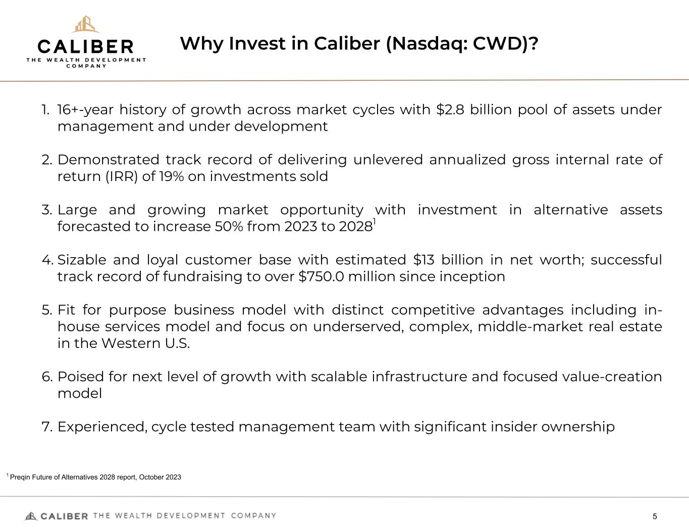 Why Invest in Caliber (Nasdaq: CWD)? 5 1. 16+-year history of growth across market cycles with $2.8 billion pool of assets under management and under development 2. Demonstrated track record of delivering unlevered annualized gross internal rate of return (IRR) of 19% on investments sold 3. Large and growing market opportunity with investment in alternative assets forecasted to increase 50% from 2023 to 20281 4. Sizable and loyal customer base with estimated $13 billion in net worth; successful track record of fundraising to over $750.0 million since inception 5. Fit for purpose business model with distinct competitive advantages including in- house services model and focus on underserved, complex, middle-market real estate in the Western U.S. 6. Poised for next level of growth with scalable infrastructure and focused value-creation model 7. Experienced, cycle tested management team with significant insider ownership 1 Preqin Future of Alternatives 2028 report, October 2023