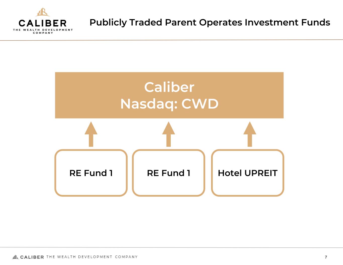 Publicly Traded Parent Operates Investment Funds 7 Caliber Nasdaq: CWD RE Fund 1 RE Fund 1 Hotel UPREIT