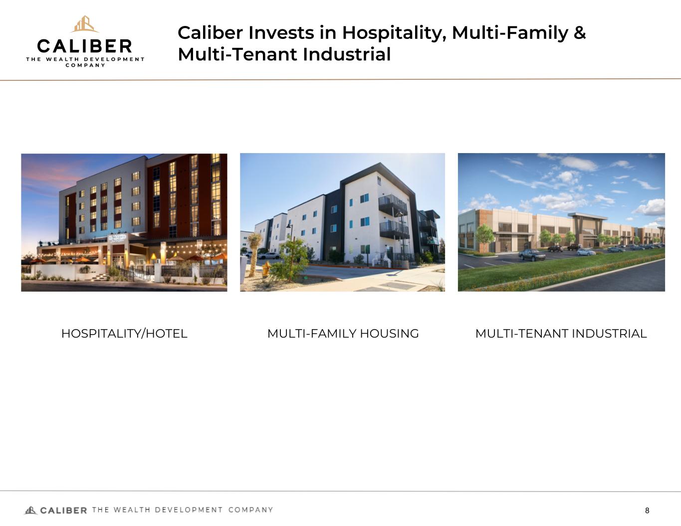 Caliber Invests in Hospitality, Multi-Family & Multi-Tenant Industrial 8 HOSPITALITY/HOTEL MULTI-FAMILY HOUSING MULTI-TENANT INDUSTRIAL