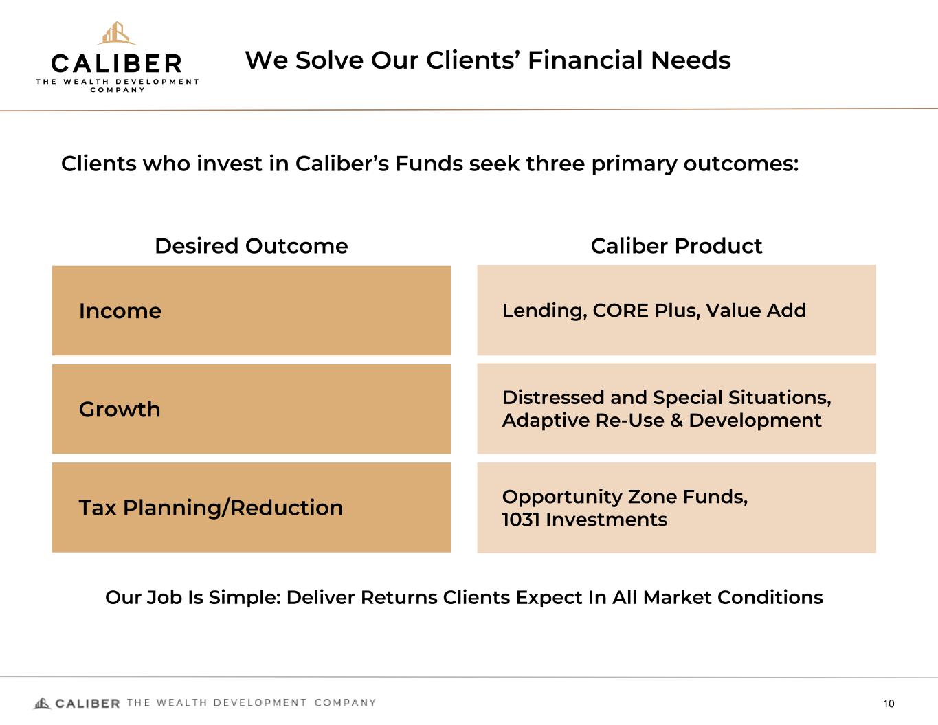 We Solve Our Clients’ Financial Needs 10 Income Lending, CORE Plus, Value Add Clients who invest in Caliber’s Funds seek three primary outcomes: Desired Outcome Caliber Product Growth Distressed and Special Situations, Adaptive Re-Use & Development Tax Planning/Reduction Opportunity Zone Funds, 1031 Investments Our Job Is Simple: Deliver Returns Clients Expect In All Market Conditions