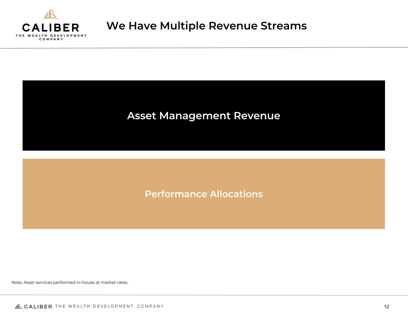 We Have Multiple Revenue Streams 12 Performance Allocations Asset Management Revenue Note: Asset services performed in-house at market rates.