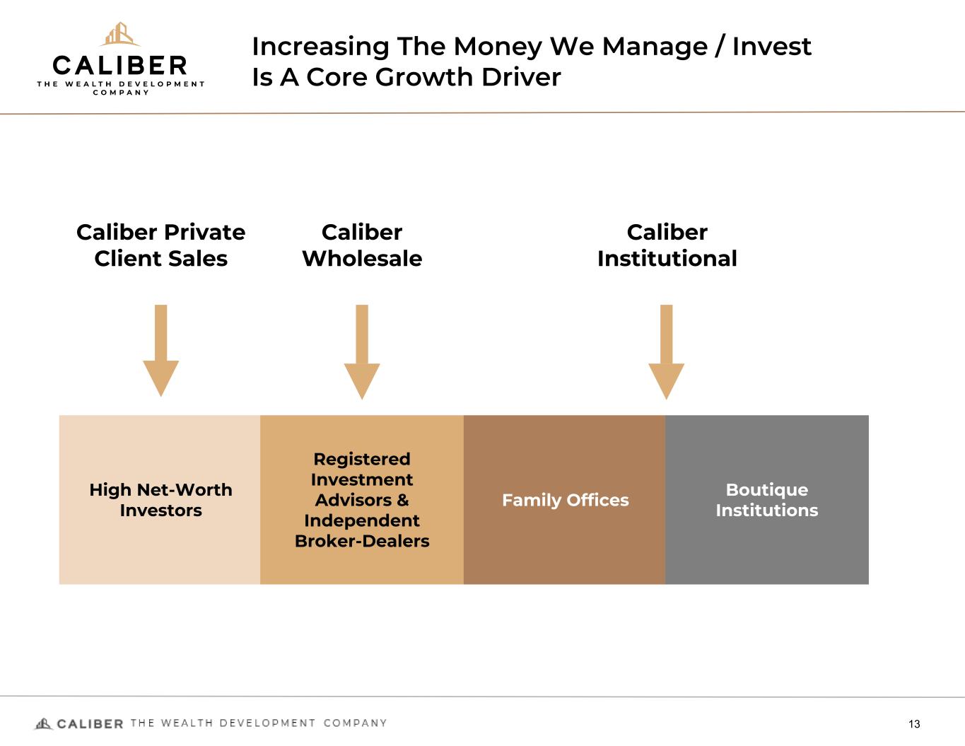 Increasing The Money We Manage / Invest Is A Core Growth Driver 13 High Net-Worth Investors Registered Investment Advisors & Independent Broker-Dealers Family Offices Boutique Institutions Caliber Private Client Sales Caliber Wholesale Caliber Institutional