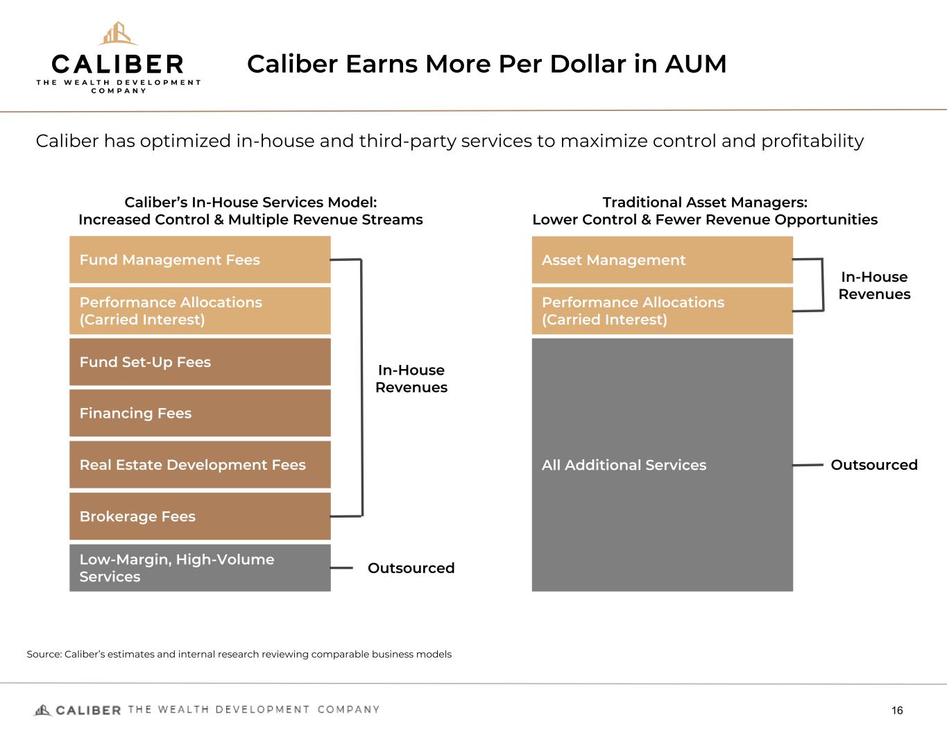 Caliber Earns More Per Dollar in AUM 16 Fund Management Fees Caliber has optimized in-house and third-party services to maximize control and profitability In-House Revenues Performance Allocations (Carried Interest) Fund Set-Up Fees Financing Fees Real Estate Development Fees Brokerage Fees Low-Margin, High-Volume Services Source: Caliber’s estimates and internal research reviewing comparable business models Caliber’s In-House Services Model: Increased Control & Multiple Revenue Streams Outsourced Traditional Asset Managers: Lower Control & Fewer Revenue Opportunities Asset Management Performance Allocations (Carried Interest) All Additional Services In-House Revenues Outsourced