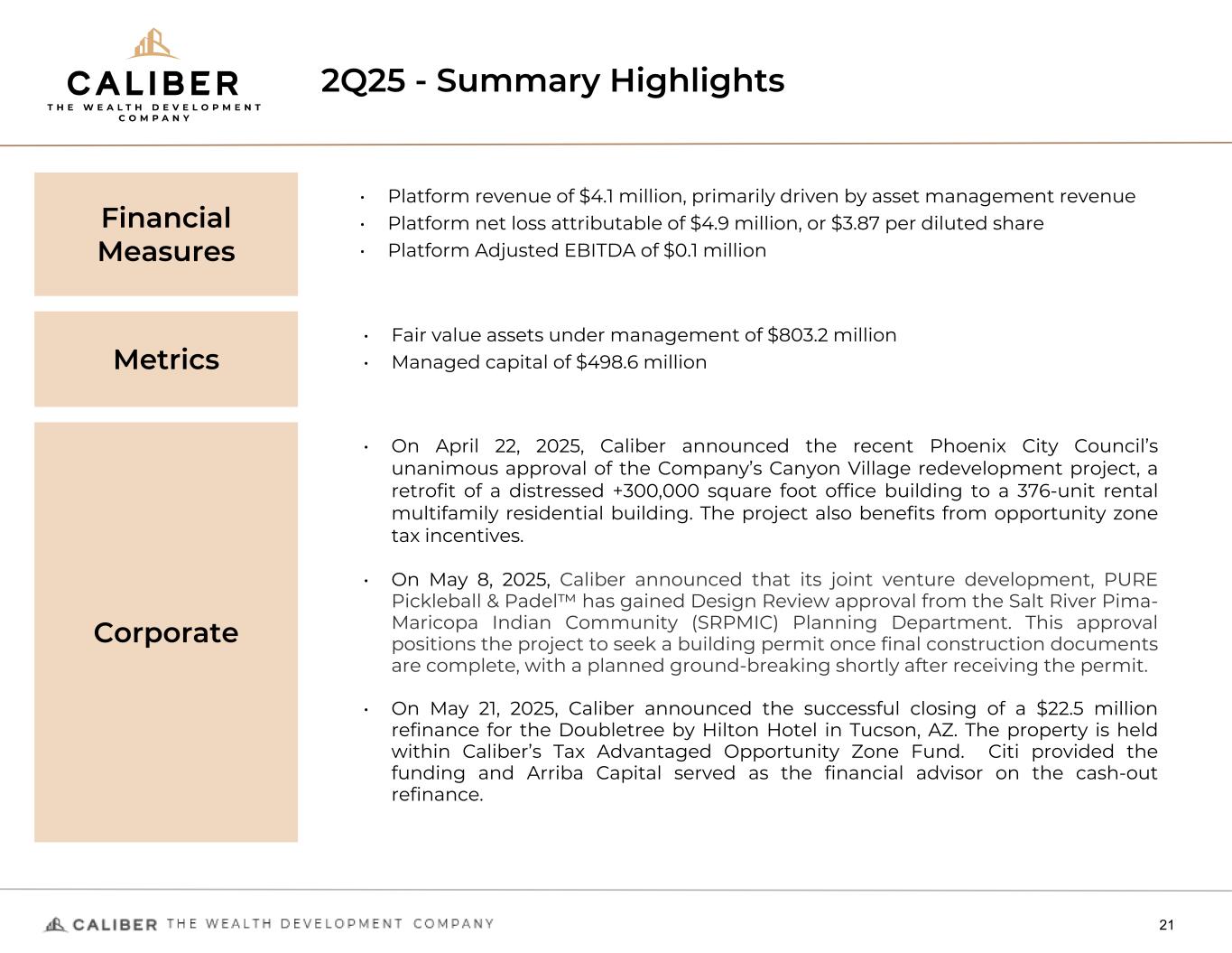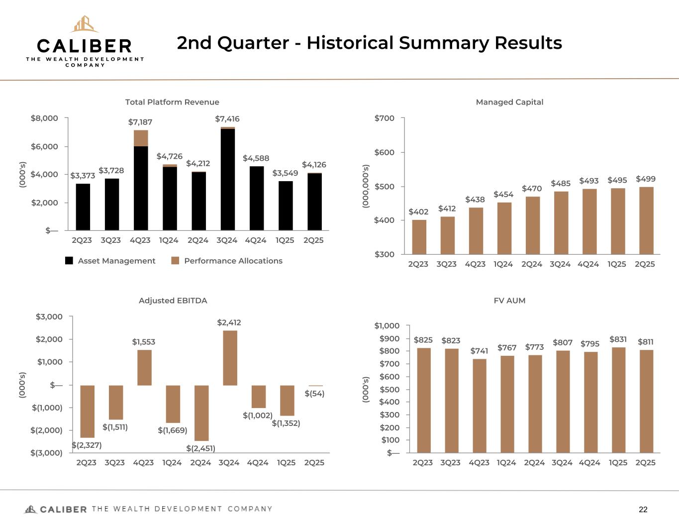 2Q25 - Summary Highlights 21 Financial Measures • Platform revenue of $4.1 million, primarily driven by asset management revenue • Platform net loss attributable of $4.9 million, or $3.87 per diluted share • Platform Adjusted EBITDA of $0.1 million Metrics • Fair value assets under management of $803.2 million • Managed capital of $498.6 million Corporate • On April 22, 2025, Caliber announced the recent Phoenix City Council’s unanimous approval of the Company’s Canyon Village redevelopment project, a retrofit of a distressed +300,000 square foot office building to a 376-unit rental multifamily residential building. The project also benefits from opportunity zone tax incentives. • On May 8, 2025, Caliber announced that its joint venture development, PURE Pickleball & Padel™ has gained Design Review approval from the Salt River Pima- Maricopa Indian Community (SRPMIC) Planning Department. This approval positions the project to seek a building permit once final construction documents are complete, with a planned ground-breaking shortly after receiving the permit. • On May 21, 2025, Caliber announced the successful closing of a $22.5 million refinance for the Doubletree by Hilton Hotel in Tucson, AZ. The property is held within Caliber’s Tax Advantaged Opportunity Zone Fund. Citi provided the funding and Arriba Capital served as the financial advisor on the cash-out refinance.