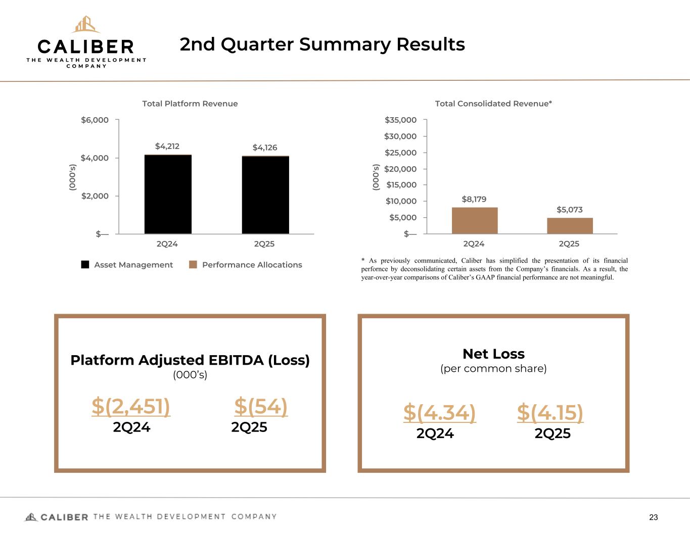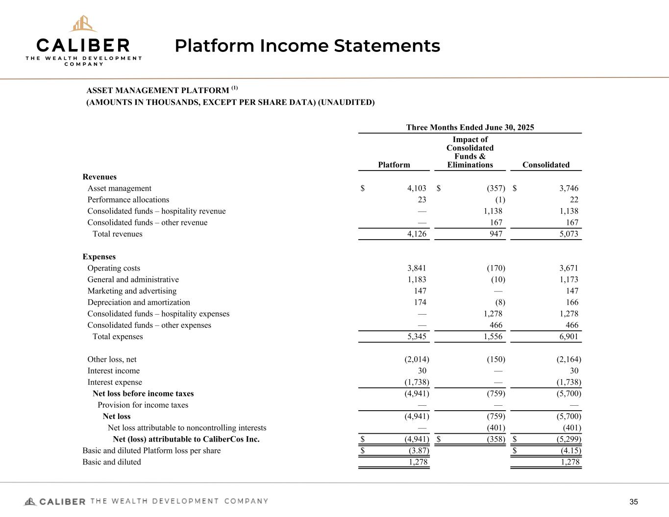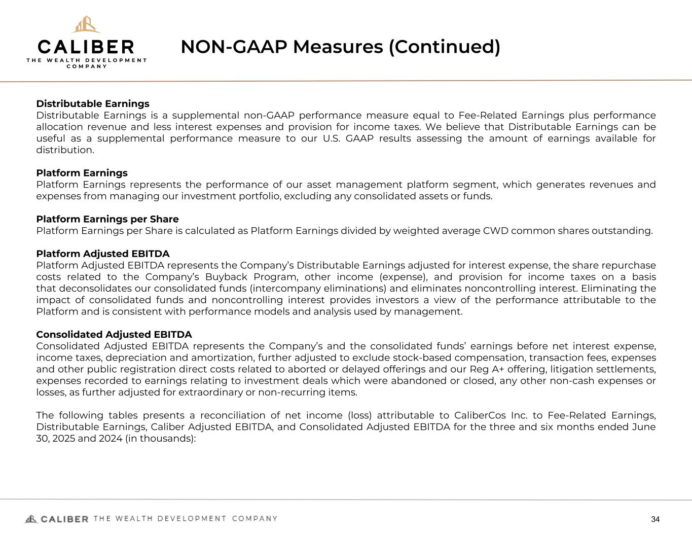NON-GAAP Measures (Continued) 34 Distributable Earnings Distributable Earnings is a supplemental non-GAAP performance measure equal to Fee-Related Earnings plus performance allocation revenue and less interest expenses and provision for income taxes. We believe that Distributable Earnings can be useful as a supplemental performance measure to our U.S. GAAP results assessing the amount of earnings available for distribution. Platform Earnings Platform Earnings represents the performance of our asset management platform segment, which generates revenues and expenses from managing our investment portfolio, excluding any consolidated assets or funds. Platform Earnings per Share Platform Earnings per Share is calculated as Platform Earnings divided by weighted average CWD common shares outstanding. Platform Adjusted EBITDA Platform Adjusted EBITDA represents the Company’s Distributable Earnings adjusted for interest expense, the share repurchase costs related to the Company’s Buyback Program, other income (expense), and provision for income taxes on a basis that deconsolidates our consolidated funds (intercompany eliminations) and eliminates noncontrolling interest. Eliminating the impact of consolidated funds and noncontrolling interest provides investors a view of the performance attributable to the Platform and is consistent with performance models and analysis used by management. Consolidated Adjusted EBITDA Consolidated Adjusted EBITDA represents the Company’s and the consolidated funds’ earnings before net interest expense, income taxes, depreciation and amortization, further adjusted to exclude stock-based compensation, transaction fees, expenses and other public registration direct costs related to aborted or delayed offerings and our Reg A+ offering, litigation settlements, expenses recorded to earnings relating to investment deals which were abandoned or closed, any other non-cash expenses or losses, as further adjusted for extraordinary or non-recurring items. The following tables presents a reconciliation of net income (loss) attributable to CaliberCos Inc. to Fee-Related Earnings, Distributable Earnings, Caliber Adjusted EBITDA, and Consolidated Adjusted EBITDA for the three and six months ended June 30, 2025 and 2024 (in thousands):