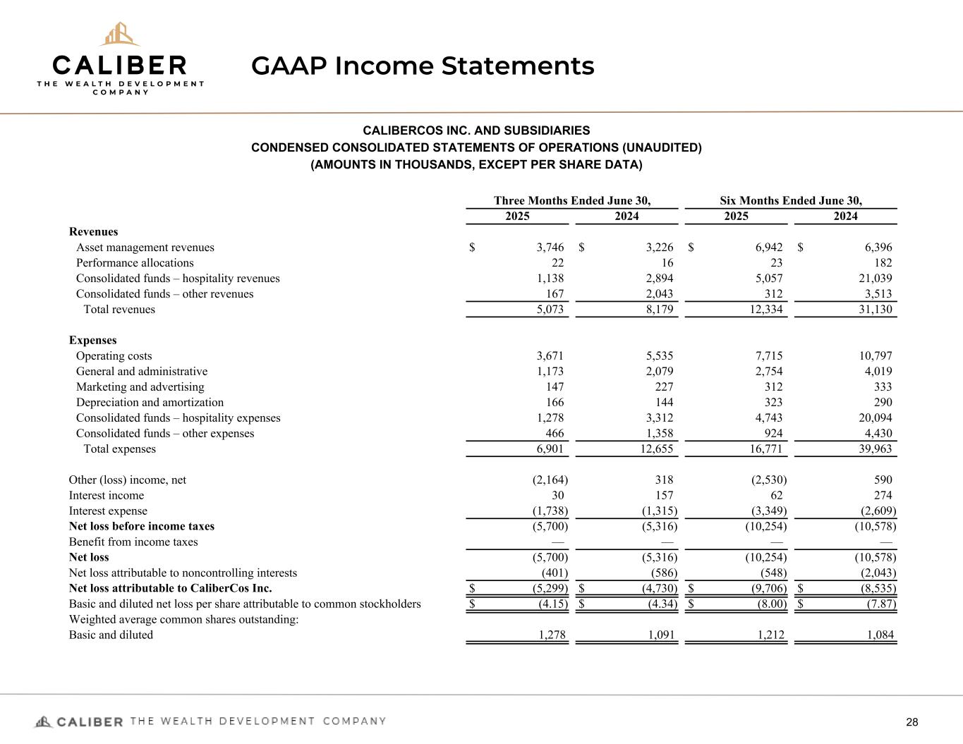 GAAP Income Statements 28 CALIBERCOS INC. AND SUBSIDIARIES CONDENSED CONSOLIDATED STATEMENTS OF OPERATIONS (UNAUDITED) (AMOUNTS IN THOUSANDS, EXCEPT PER SHARE DATA) Three Months Ended June 30, Six Months Ended June 30, 2025 2024 2025 2024 Revenues Asset management revenues $ 3,746 $ 3,226 $ 6,942 $ 6,396 Performance allocations 22 16 23 182 Consolidated funds – hospitality revenues 1,138 2,894 5,057 21,039 Consolidated funds – other revenues 167 2,043 312 3,513 Total revenues 5,073 8,179 12,334 31,130 Expenses Operating costs 3,671 5,535 7,715 10,797 General and administrative 1,173 2,079 2,754 4,019 Marketing and advertising 147 227 312 333 Depreciation and amortization 166 144 323 290 Consolidated funds – hospitality expenses 1,278 3,312 4,743 20,094 Consolidated funds – other expenses 466 1,358 924 4,430 Total expenses 6,901 12,655 16,771 39,963 Other (loss) income, net (2,164) 318 (2,530) 590 Interest income 30 157 62 274 Interest expense (1,738) (1,315) (3,349) (2,609) Net loss before income taxes (5,700) (5,316) (10,254) (10,578) Benefit from income taxes — — — — Net loss (5,700) (5,316) (10,254) (10,578) Net loss attributable to noncontrolling interests (401) (586) (548) (2,043) Net loss attributable to CaliberCos Inc. $ (5,299) $ (4,730) $ (9,706) $ (8,535) Basic and diluted net loss per share attributable to common stockholders $ (4.15) $ (4.34) $ (8.00) $ (7.87) Weighted average common shares outstanding: Basic and diluted 1,278 1,091 1,212 1,084