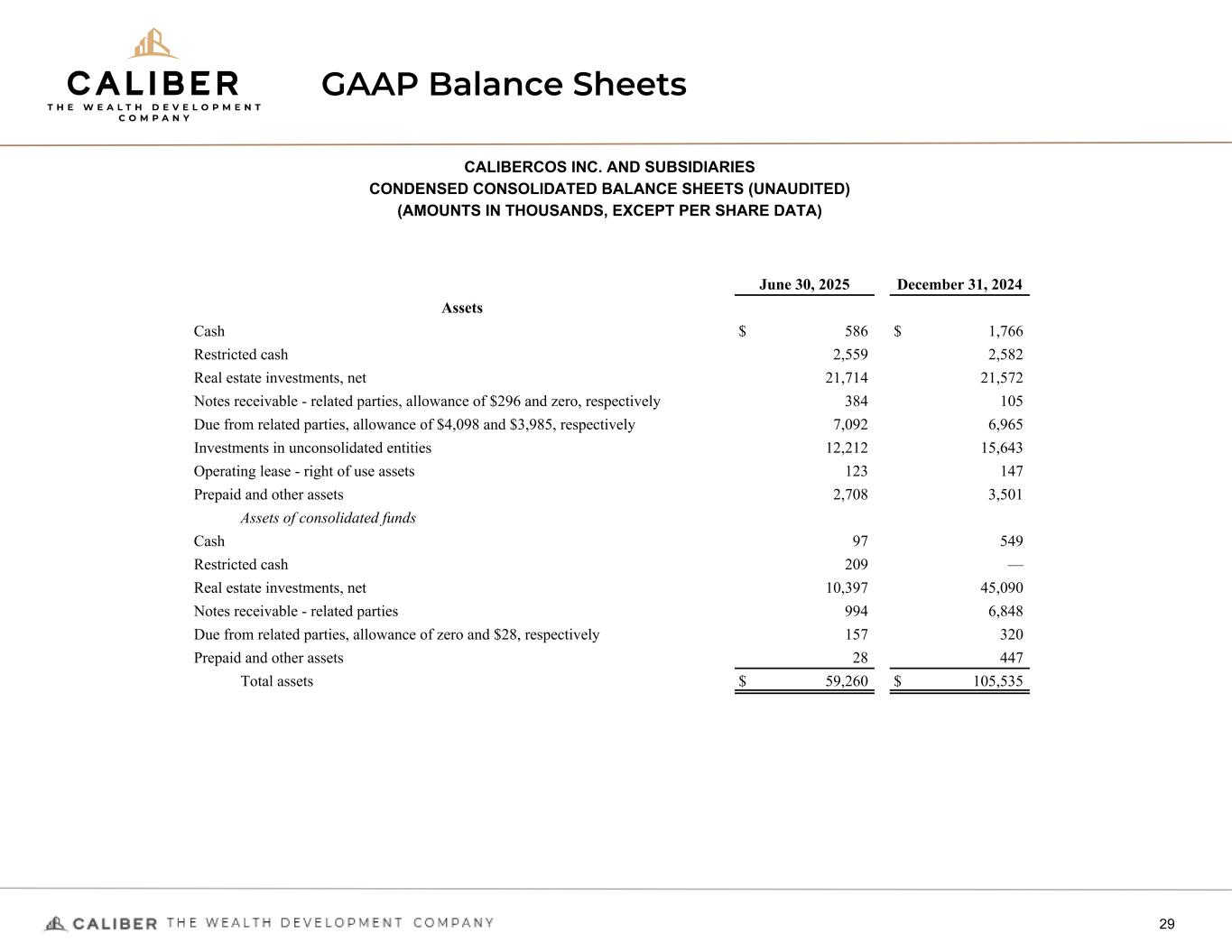 GAAP Balance Sheets 29 CALIBERCOS INC. AND SUBSIDIARIES CONDENSED CONSOLIDATED BALANCE SHEETS (UNAUDITED) (AMOUNTS IN THOUSANDS, EXCEPT PER SHARE DATA) June 30, 2025 December 31, 2024 Assets Cash $ 586 $ 1,766 Restricted cash 2,559 2,582 Real estate investments, net 21,714 21,572 Notes receivable - related parties, allowance of $296 and zero, respectively 384 105 Due from related parties, allowance of $4,098 and $3,985, respectively 7,092 6,965 Investments in unconsolidated entities 12,212 15,643 Operating lease - right of use assets 123 147 Prepaid and other assets 2,708 3,501 Assets of consolidated funds Cash 97 549 Restricted cash 209 — Real estate investments, net 10,397 45,090 Notes receivable - related parties 994 6,848 Due from related parties, allowance of zero and $28, respectively 157 320 Prepaid and other assets 28 447 Total assets $ 59,260 $ 105,535