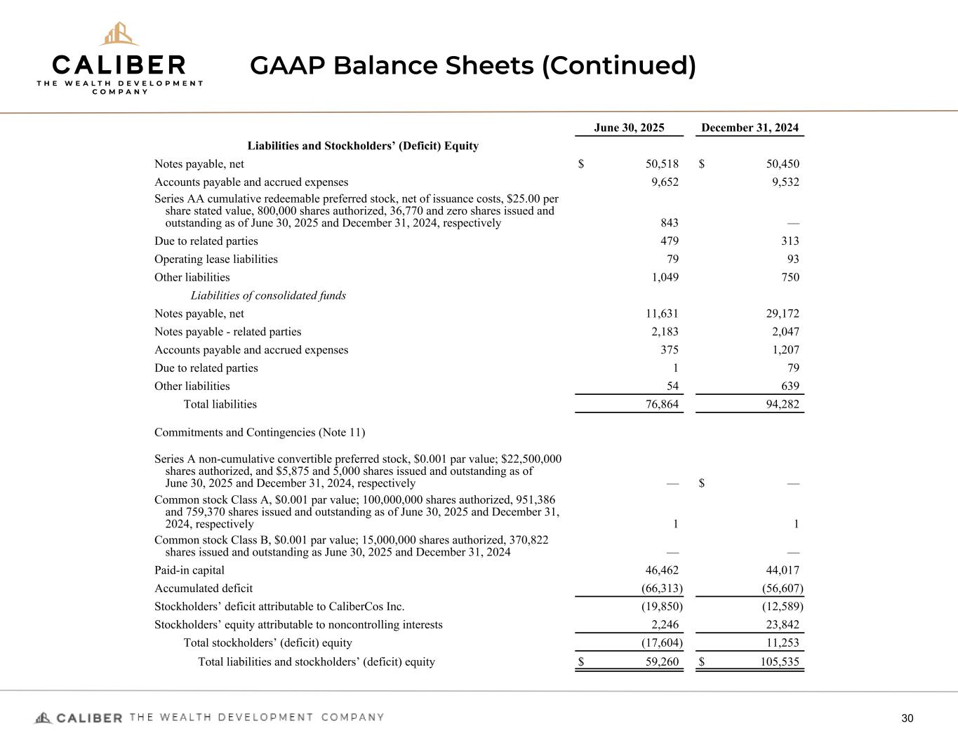 GAAP Balance Sheets (Continued) 30 June 30, 2025 December 31, 2024 Liabilities and Stockholders’ (Deficit) Equity Notes payable, net $ 50,518 $ 50,450 Accounts payable and accrued expenses 9,652 9,532 Series AA cumulative redeemable preferred stock, net of issuance costs, $25.00 per share stated value, 800,000 shares authorized, 36,770 and zero shares issued and outstanding as of June 30, 2025 and December 31, 2024, respectively 843 — Due to related parties 479 313 Operating lease liabilities 79 93 Other liabilities 1,049 750 Liabilities of consolidated funds Notes payable, net 11,631 29,172 Notes payable - related parties 2,183 2,047 Accounts payable and accrued expenses 375 1,207 Due to related parties 1 79 Other liabilities 54 639 Total liabilities 76,864 94,282 Commitments and Contingencies (Note 11) Series A non-cumulative convertible preferred stock, $0.001 par value; $22,500,000 shares authorized, and $5,875 and 5,000 shares issued and outstanding as of June 30, 2025 and December 31, 2024, respectively — $ — Common stock Class A, $0.001 par value; 100,000,000 shares authorized, 951,386 and 759,370 shares issued and outstanding as of June 30, 2025 and December 31, 2024, respectively 1 1 Common stock Class B, $0.001 par value; 15,000,000 shares authorized, 370,822 shares issued and outstanding as June 30, 2025 and December 31, 2024 — — Paid-in capital 46,462 44,017 Accumulated deficit (66,313) (56,607) Stockholders’ deficit attributable to CaliberCos Inc. (19,850) (12,589) Stockholders’ equity attributable to noncontrolling interests 2,246 23,842 Total stockholders’ (deficit) equity (17,604) 11,253 Total liabilities and stockholders’ (deficit) equity $ 59,260 $ 105,535