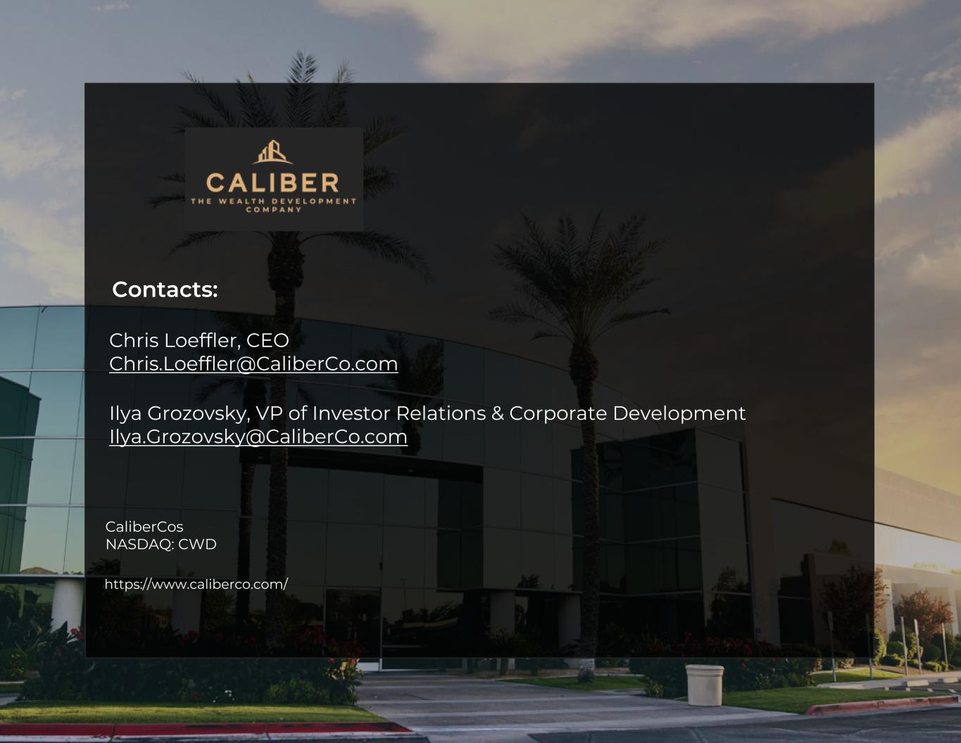 Contacts: Chris Loeffler, CEO Chris.Loeffler@CaliberCo.com Ilya Grozovsky, VP of Investor Relations & Corporate Development Ilya.Grozovsky@CaliberCo.com CaliberCos NASDAQ: CWD https://www.caliberco.com/