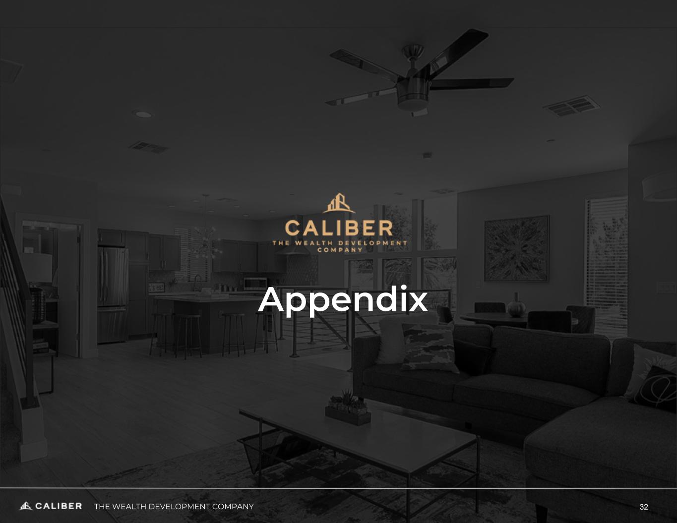Today’s Speakers Chris Loeffler CHIEF EXECUTIVE OFFICER Chris Loeffler has served as the CEO and Chairman of Caliber’s Board of Directors since its inception. As CEO, Chris directs and executes global strategy, oversees investments and fund management, and contributes to private and public capital formation. As a Co-Founder Chris took an early role forming the Company’s financial and operational infrastructure and navigating the vertical integration of all real estate and investment services. 3 Jade Leung CHIEF FINANCIAL OFFICER Jade Leung is Caliber’s CFO and corporate secretary. As CFO, Jade oversees all aspects of accounting and controllership, financial planning and analysis, tax, financial reporting, and treasury functions at Caliber. Jade is also responsible for the strategic direction of Caliber’s information technology and data security initiatives. Prior to joining Caliber, Jade spent 12 years with PwC, where he managed audit and accounting advisory services. Notably, Jade participated in over $1 billion of public market transactions and financing arrangements for companies.