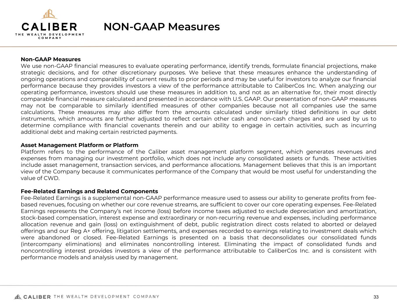 NON-GAAP Measures 33 Non-GAAP Measures We use non-GAAP financial measures to evaluate operating performance, identify trends, formulate financial projections, make strategic decisions, and for other discretionary purposes. We believe that these measures enhance the understanding of ongoing operations and comparability of current results to prior periods and may be useful for investors to analyze our financial performance because they provides investors a view of the performance attributable to CaliberCos Inc. When analyzing our operating performance, investors should use these measures in addition to, and not as an alternative for, their most directly comparable financial measure calculated and presented in accordance with U.S. GAAP. Our presentation of non-GAAP measures may not be comparable to similarly identified measures of other companies because not all companies use the same calculations. These measures may also differ from the amounts calculated under similarly titled definitions in our debt instruments, which amounts are further adjusted to reflect certain other cash and non-cash charges and are used by us to determine compliance with financial covenants therein and our ability to engage in certain activities, such as incurring additional debt and making certain restricted payments. Asset Management Platform or Platform Platform refers to the performance of the Caliber asset management platform segment, which generates revenues and expenses from managing our investment portfolio, which does not include any consolidated assets or funds.  These activities include asset management, transaction services, and performance allocations. Management believes that this is an important view of the Company because it communicates performance of the Company that would be most useful for understanding the value of CWD. Fee-Related Earnings and Related Components Fee-Related Earnings is a supplemental non-GAAP performance measure used to assess our ability to generate profits from fee- based revenues, focusing on whether our core revenue streams, are sufficient to cover our core operating expenses. Fee-Related Earnings represents the Company’s net income (loss) before income taxes adjusted to exclude depreciation and amortization, stock-based compensation, interest expense and extraordinary or non-recurring revenue and expenses, including performance allocation revenue and gain (loss) on extinguishment of debt, public registration direct costs related to aborted or delayed offerings and our Reg A+ offering, litigation settlements, and expenses recorded to earnings relating to investment deals which were abandoned or closed. Fee-Related Earnings is presented on a basis that  deconsolidates our consolidated funds (intercompany eliminations) and eliminates noncontrolling interest. Eliminating the impact of consolidated funds and noncontrolling interest provides investors a view of the performance attributable to CaliberCos Inc. and is consistent with performance models and analysis used by management.