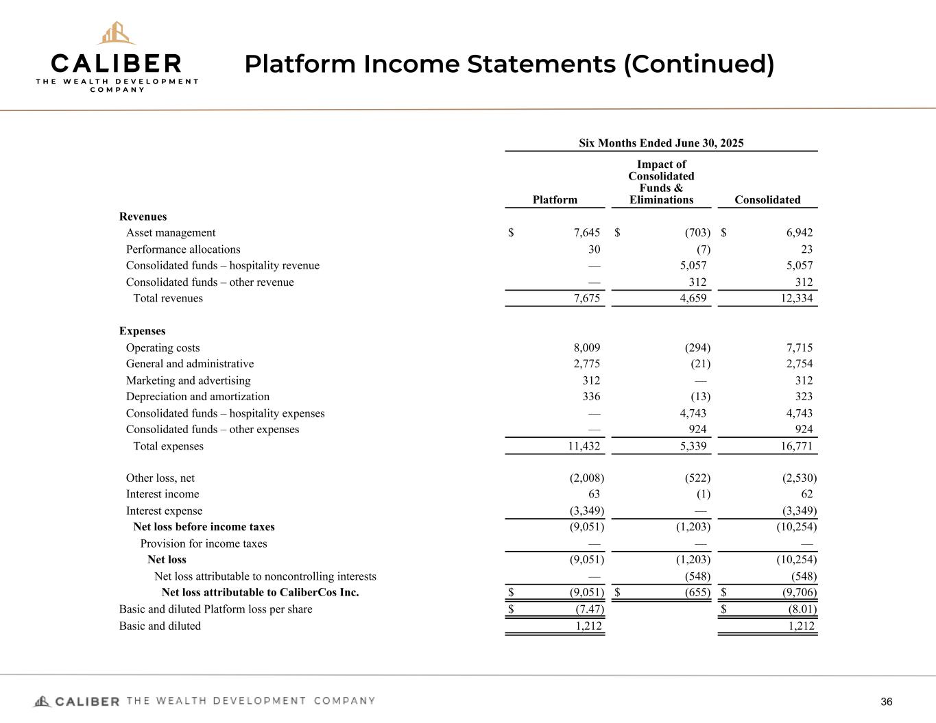 Platform Income Statements 35 ASSET MANAGEMENT PLATFORM (1) (AMOUNTS IN THOUSANDS, EXCEPT PER SHARE DATA) (UNAUDITED) Three Months Ended June 30, 2025 Platform Impact of Consolidated Funds & Eliminations Consolidated Revenues Asset management $ 4,103 $ (357) $ 3,746 Performance allocations 23 (1) 22 Consolidated funds – hospitality revenue — 1,138 1,138 Consolidated funds – other revenue — 167 167 Total revenues 4,126 947 5,073 Expenses Operating costs 3,841 (170) 3,671 General and administrative 1,183 (10) 1,173 Marketing and advertising 147 — 147 Depreciation and amortization 174 (8) 166 Consolidated funds – hospitality expenses — 1,278 1,278 Consolidated funds – other expenses — 466 466 Total expenses 5,345 1,556 6,901 Other loss, net (2,014) (150) (2,164) Interest income 30 — 30 Interest expense (1,738) — (1,738) Net loss before income taxes (4,941) (759) (5,700) Provision for income taxes — — — Net loss (4,941) (759) (5,700) Net loss attributable to noncontrolling interests — (401) (401) Net (loss) attributable to CaliberCos Inc. $ (4,941) $ (358) $ (5,299) Basic and diluted Platform loss per share $ (3.87) $ (4.15) Basic and diluted 1,278 1,278