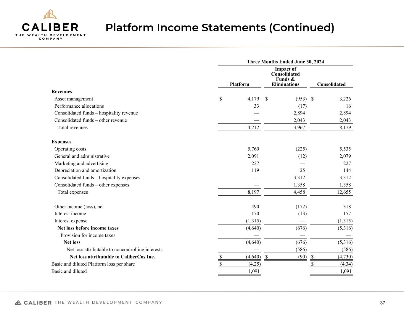 Platform Income Statements (Continued) 36 Six Months Ended June 30, 2025 Platform Impact of Consolidated Funds & Eliminations Consolidated Revenues Asset management $ 7,645 $ (703) $ 6,942 Performance allocations 30 (7) 23 Consolidated funds – hospitality revenue — 5,057 5,057 Consolidated funds – other revenue — 312 312 Total revenues 7,675 4,659 12,334 Expenses Operating costs 8,009 (294) 7,715 General and administrative 2,775 (21) 2,754 Marketing and advertising 312 — 312 Depreciation and amortization 336 (13) 323 Consolidated funds – hospitality expenses — 4,743 4,743 Consolidated funds – other expenses — 924 924 Total expenses 11,432 5,339 16,771 Other loss, net (2,008) (522) (2,530) Interest income 63 (1) 62 Interest expense (3,349) — (3,349) Net loss before income taxes (9,051) (1,203) (10,254) Provision for income taxes — — — Net loss (9,051) (1,203) (10,254) Net loss attributable to noncontrolling interests — (548) (548) Net loss attributable to CaliberCos Inc. $ (9,051) $ (655) $ (9,706) Basic and diluted Platform loss per share $ (7.47) $ (8.01) Basic and diluted 1,212 1,212