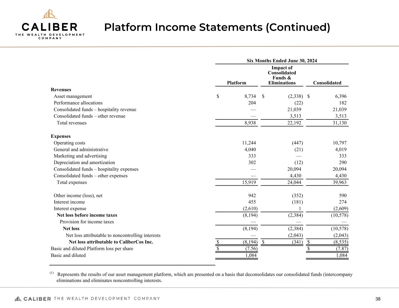 Platform Income Statements (Continued) 37 Three Months Ended June 30, 2024 Platform Impact of Consolidated Funds & Eliminations Consolidated Revenues Asset management $ 4,179 $ (953) $ 3,226 Performance allocations 33 (17) 16 Consolidated funds – hospitality revenue — 2,894 2,894 Consolidated funds – other revenue — 2,043 2,043 Total revenues 4,212 3,967 8,179 Expenses Operating costs 5,760 (225) 5,535 General and administrative 2,091 (12) 2,079 Marketing and advertising 227 — 227 Depreciation and amortization 119 25 144 Consolidated funds – hospitality expenses — 3,312 3,312 Consolidated funds – other expenses — 1,358 1,358 Total expenses 8,197 4,458 12,655 Other income (loss), net 490 (172) 318 Interest income 170 (13) 157 Interest expense (1,315) — (1,315) Net loss before income taxes (4,640) (676) (5,316) Provision for income taxes — — — Net loss (4,640) (676) (5,316) Net loss attributable to noncontrolling interests — (586) (586) Net loss attributable to CaliberCos Inc. $ (4,640) $ (90) $ (4,730) Basic and diluted Platform loss per share $ (4.25) $ (4.34) Basic and diluted 1,091 1,091
