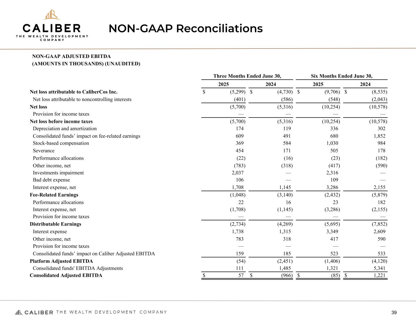 NON-GAAP Reconciliations 39 NON-GAAP ADJUSTED EBITDA (AMOUNTS IN THOUSANDS) (UNAUDITED) Three Months Ended June 30, Six Months Ended June 30, 2025 2024 2025 2024 Net loss attributable to CaliberCos Inc. $ (5,299) $ (4,730) $ (9,706) $ (8,535) Net loss attributable to noncontrolling interests (401) (586) (548) (2,043) Net loss (5,700) (5,316) (10,254) (10,578) Provision for income taxes — — — — Net loss before income taxes (5,700) (5,316) (10,254) (10,578) Depreciation and amortization 174 119 336 302 Consolidated funds’ impact on fee-related earnings 609 491 680 1,852 Stock-based compensation 369 584 1,030 984 Severance 454 171 505 178 Performance allocations (22) (16) (23) (182) Other income, net (783) (318) (417) (590) Investments impairment 2,037 — 2,316 — Bad debt expense 106 — 109 — Interest expense, net 1,708 1,145 3,286 2,155 Fee-Related Earnings (1,048) (3,140) (2,432) (5,879) Performance allocations 22 16 23 182 Interest expense, net (1,708) (1,145) (3,286) (2,155) Provision for income taxes — — — — Distributable Earnings (2,734) (4,269) (5,695) (7,852) Interest expense 1,738 1,315 3,349 2,609 Other income, net 783 318 417 590 Provision for income taxes — — — — Consolidated funds’ impact on Caliber Adjusted EBITDA 159 185 523 533 Platform Adjusted EBITDA (54) (2,451) (1,406) (4,120) Consolidated funds' EBITDA Adjustments 111 1,485 1,321 5,341 Consolidated Adjusted EBITDA $ 57 $ (966) $ (85) $ 1,221
