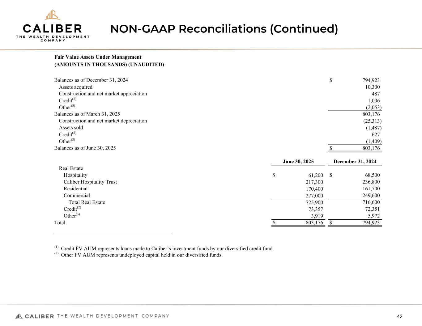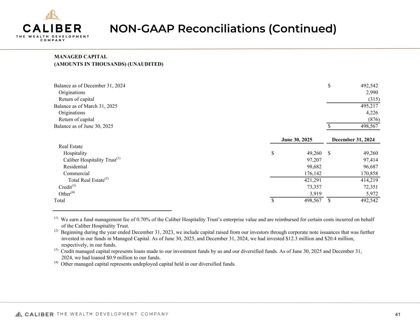 NON-GAAP Reconciliations (Continued) 41 MANAGED CAPITAL (AMOUNTS IN THOUSANDS) (UNAUDITED) Balance as of December 31, 2024 $ 492,542 Originations 2,990 Return of capital (315) Balance as of March 31, 2025 495,217 Originations 4,226 Return of capital (876) Balance as of June 30, 2025 $ 498,567 June 30, 2025 December 31, 2024 Real Estate Hospitality $ 49,260 $ 49,260 Caliber Hospitality Trust(1) 97,207 97,414 Residential 98,682 96,687 Commercial 176,142 170,858 Total Real Estate(2) 421,291 414,219 Credit(3) 73,357 72,351 Other(4) 3,919 5,972 Total $ 498,567 $ 492,542 (1) We earn a fund management fee of 0.70% of the Caliber Hospitality Trust’s enterprise value and are reimbursed for certain costs incurred on behalf of the Caliber Hospitality Trust. (2) Beginning during the year ended December 31, 2023, we include capital raised from our investors through corporate note issuances that was further invested in our funds in Managed Capital. As of June 30, 2025, and December 31, 2024, we had invested $12.3 million and $20.4 million, respectively, in our funds. (3) Credit managed capital represents loans made to our investment funds by us and our diversified funds. As of June 30, 2025 and December 31, 2024, we had loaned $0.9 million to our funds. (4) Other managed capital represents undeployed capital held in our diversified funds.