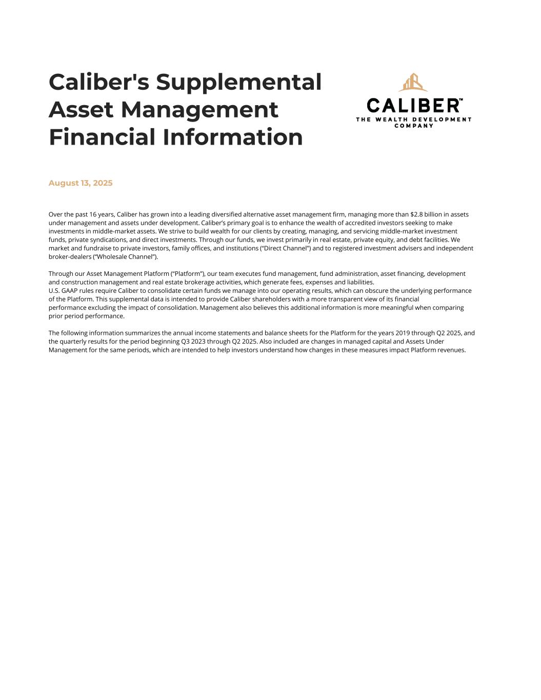 Over the past 16 years, Caliber has grown into a leading diversified alternative asset management firm, managing more than $2.8 billion in assets under management and assets under development. Caliber’s primary goal is to enhance the wealth of accredited investors seeking to make investments in middle-market assets. We strive to build wealth for our clients by creating, managing, and servicing middle-market investment funds, private syndications, and direct investments. Through our funds, we invest primarily in real estate, private equity, and debt facilities. We market and fundraise to private investors, family offices, and institutions (“Direct Channel”) and to registered investment advisers and independent broker-dealers (“Wholesale Channel”). Through our Asset Management Platform (“Platform”), our team executes fund management, fund administration, asset financing, development and construction management and real estate brokerage activities, which generate fees, expenses and liabilities. U.S. GAAP rules require Caliber to consolidate certain funds we manage into our operating results, which can obscure the underlying performance of the Platform. This supplemental data is intended to provide Caliber shareholders with a more transparent view of its financial performance excluding the impact of consolidation. Management also believes this additional information is more meaningful when comparing prior period performance. The following information summarizes the annual income statements and balance sheets for the Platform for the years 2019 through Q2 2025, and the quarterly results for the period beginning Q3 2023 through Q2 2025. Also included are changes in managed capital and Assets Under Management for the same periods, which are intended to help investors understand how changes in these measures impact Platform revenues. Caliber's Supplemental Asset Management Financial Information August 13, 2025