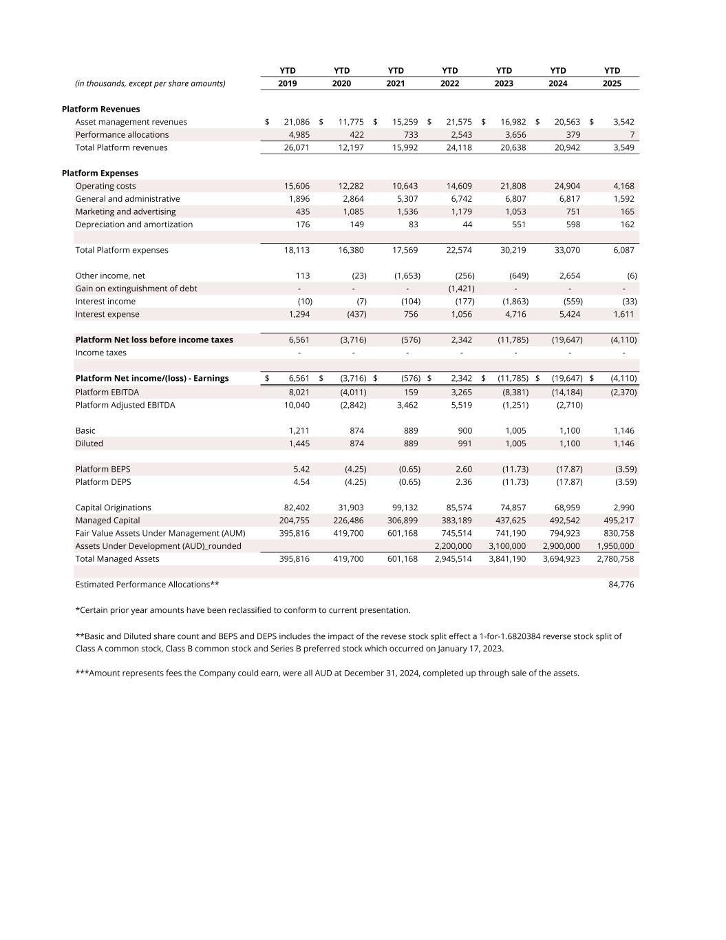 YTD YTD YTD YTD YTD YTD YTD (in thousands, except per share amounts) 2019 2020 2021 2022 2023 2024 2025 Platform Revenues Asset management revenues 21,086$ 11,775$ 15,259$ 21,575$ 16,982$ 20,563$ 3,542$ Performance allocations 4,985 422 733 2,543 3,656 379 7 Total Platform revenues 26,071 12,197 15,992 24,118 20,638 20,942 3,549 Platform Expenses Operating costs 15,606 12,282 10,643 14,609 21,808 24,904 4,168 General and administrative 1,896 2,864 5,307 6,742 6,807 6,817 1,592 Marketing and advertising 435 1,085 1,536 1,179 1,053 751 165 Depreciation and amortization 176 149 83 44 551 598 162 Total Platform expenses 18,113 16,380 17,569 22,574 30,219 33,070 6,087 Other income, net 113 (23) (1,653) (256) (649) 2,654 (6) Gain on extinguishment of debt - - - (1,421) - - - Interest income (10) (7) (104) (177) (1,863) (559) (33) Interest expense 1,294 (437) 756 1,056 4,716 5,424 1,611 Platform Net loss before income taxes 6,561 (3,716) (576) 2,342 (11,785) (19,647) (4,110) Income taxes - - - - - - - Platform Net income/(loss) - Earnings 6,561$ (3,716)$ (576)$ 2,342$ (11,785)$ (19,647)$ (4,110)$ Platform EBITDA 8,021 (4,011) 159 3,265 (8,381) (14,184) (2,370) Platform Adjusted EBITDA 10,040 (2,842) 3,462 5,519 (1,251) (2,710) Basic 1,211 874 889 900 1,005 1,100 1,146 Diluted 1,445 874 889 991 1,005 1,100 1,146 Platform BEPS 5.42 (4.25) (0.65) 2.60 (11.73) (17.87) (3.59) Platform DEPS 4.54 (4.25) (0.65) 2.36 (11.73) (17.87) (3.59) Capital Originations 82,402 31,903 99,132 85,574 74,857 68,959 2,990 Managed Capital 204,755 226,486 306,899 383,189 437,625 492,542 495,217 Fair Value Assets Under Management (AUM) 395,816 419,700 601,168 745,514 741,190 794,923 830,758 Assets Under Development (AUD)_rounded 2,200,000 3,100,000 2,900,000 1,950,000 Total Managed Assets 395,816 419,700 601,168 2,945,514 3,841,190 3,694,923 2,780,758 Estimated Performance Allocations** 84,776 *Certain prior year amounts have been reclassified to conform to current presentation. ***Amount represents fees the Company could earn, were all AUD at December 31, 2024, completed up through sale of the assets. **Basic and Diluted share count and BEPS and DEPS includes the impact of the revese stock split effect a 1-for-1.6820384 reverse stock split of Class A common stock, Class B common stock and Series B preferred stock which occurred on January 17, 2023.