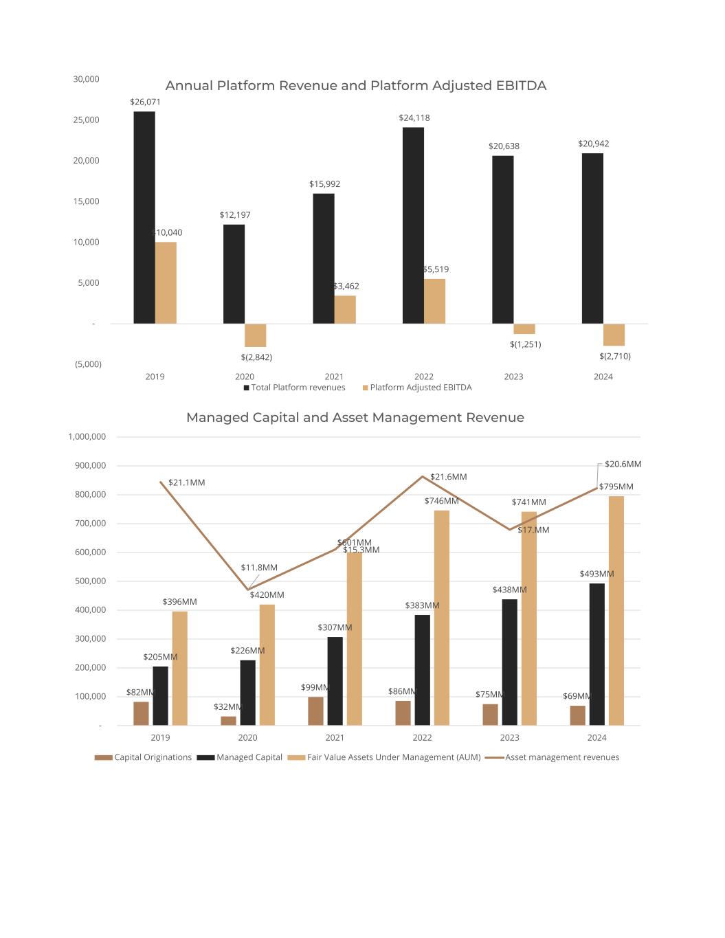 $26,071 $12,197 $15,992 $24,118 $20,638 $20,942 $10,040 $(2,842) $3,462 $5,519 $(1,251) $(2,710) (5,000) - 5,000 10,000 15,000 20,000 25,000 30,000 2019 2020 2021 2022 2023 2024 Annual Platform Revenue and Platform Adjusted EBITDA Total Platform revenues Platform Adjusted EBITDA $82MM $32MM $99MM $86MM $75MM $69MM $205MM $226MM $307MM $383MM $438MM $493MM $396MM $420MM $601MM $746MM $741MM $795MM$21.1MM $11.8MM $15.3MM $21.6MM $17.MM $20.6MM - 100,000 200,000 300,000 400,000 500,000 600,000 700,000 800,000 900,000 1,000,000 2019 2020 2021 2022 2023 2024 Managed Capital and Asset Management Revenue Capital Originations Managed Capital Fair Value Assets Under Management (AUM) Asset management revenues