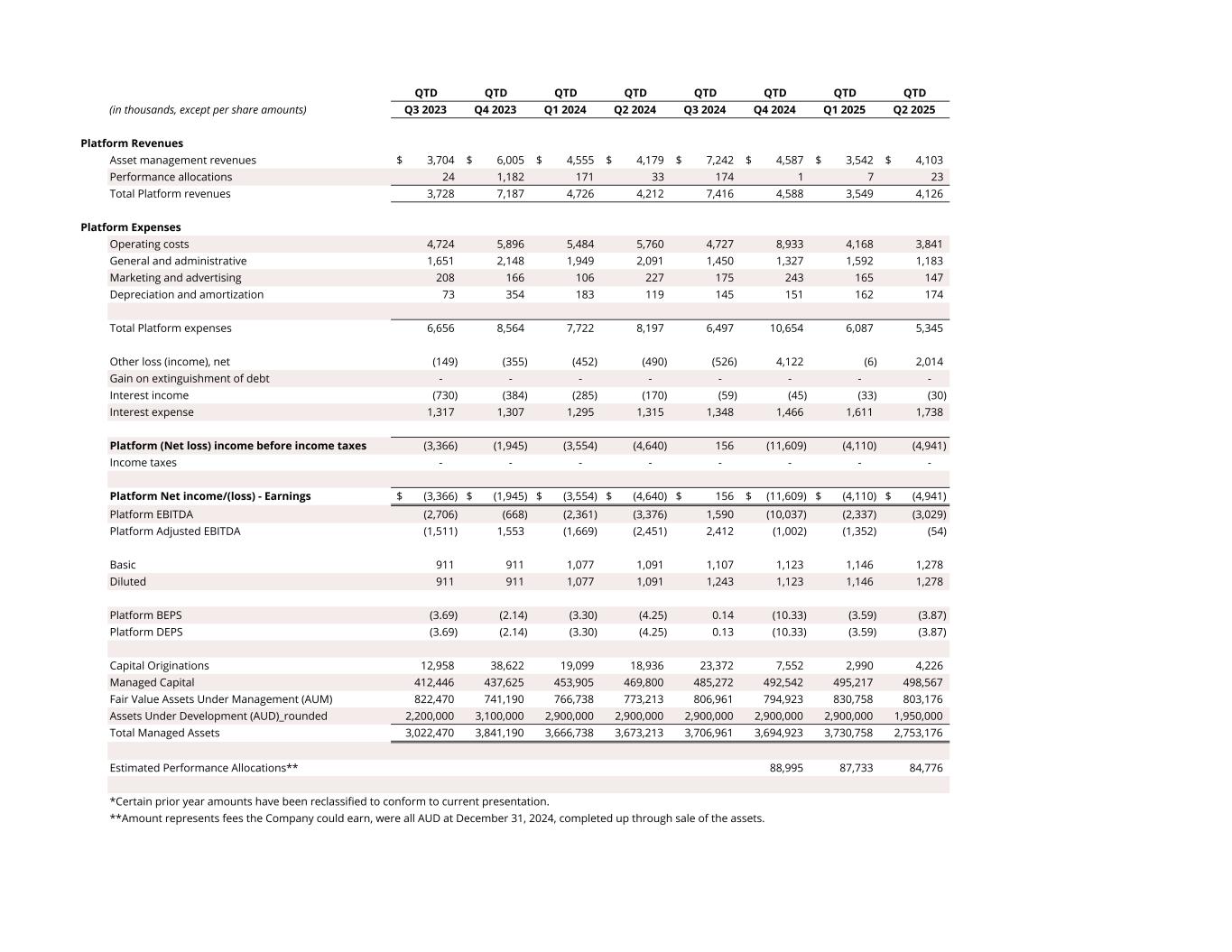 QTD QTD QTD QTD QTD QTD QTD QTD (in thousands, except per share amounts) Q3 2023 Q4 2023 Q1 2024 Q2 2024 Q3 2024 Q4 2024 Q1 2025 Q2 2025 Platform Revenues Asset management revenues 3,704$ 6,005$ 4,555$ 4,179$ 7,242$ 4,587$ 3,542$ 4,103$ Performance allocations 24 1,182 171 33 174 1 7 23 Total Platform revenues 3,728 7,187 4,726 4,212 7,416 4,588 3,549 4,126 Platform Expenses Operating costs 4,724 5,896 5,484 5,760 4,727 8,933 4,168 3,841 General and administrative 1,651 2,148 1,949 2,091 1,450 1,327 1,592 1,183 Marketing and advertising 208 166 106 227 175 243 165 147 Depreciation and amortization 73 354 183 119 145 151 162 174 Total Platform expenses 6,656 8,564 7,722 8,197 6,497 10,654 6,087 5,345 Other loss (income), net (149) (355) (452) (490) (526) 4,122 (6) 2,014 Gain on extinguishment of debt - - - - - - - - Interest income (730) (384) (285) (170) (59) (45) (33) (30) Interest expense 1,317 1,307 1,295 1,315 1,348 1,466 1,611 1,738 Platform (Net loss) income before income taxes (3,366) (1,945) (3,554) (4,640) 156 (11,609) (4,110) (4,941) Income taxes - - - - - - - - Platform Net income/(loss) - Earnings (3,366)$ (1,945)$ (3,554)$ (4,640)$ 156$ (11,609)$ (4,110)$ (4,941)$ Platform EBITDA (2,706) (668) (2,361) (3,376) 1,590 (10,037) (2,337) (3,029) Platform Adjusted EBITDA (1,511) 1,553 (1,669) (2,451) 2,412 (1,002) (1,352) (54) Basic 911 911 1,077 1,091 1,107 1,123 1,146 1,278 Diluted 911 911 1,077 1,091 1,243 1,123 1,146 1,278 Platform BEPS (3.69) (2.14) (3.30) (4.25) 0.14 (10.33) (3.59) (3.87) Platform DEPS (3.69) (2.14) (3.30) (4.25) 0.13 (10.33) (3.59) (3.87) Capital Originations 12,958 38,622 19,099 18,936 23,372 7,552 2,990 4,226 Managed Capital 412,446 437,625 453,905 469,800 485,272 492,542 495,217 498,567 Fair Value Assets Under Management (AUM) 822,470 741,190 766,738 773,213 806,961 794,923 830,758 803,176 Assets Under Development (AUD)_rounded 2,200,000 3,100,000 2,900,000 2,900,000 2,900,000 2,900,000 2,900,000 1,950,000 Total Managed Assets 3,022,470 3,841,190 3,666,738 3,673,213 3,706,961 3,694,923 3,730,758 2,753,176 Estimated Performance Allocations** 88,995 87,733 84,776 *Certain prior year amounts have been reclassified to conform to current presentation. **Amount represents fees the Company could earn, were all AUD at December 31, 2024, completed up through sale of the assets.