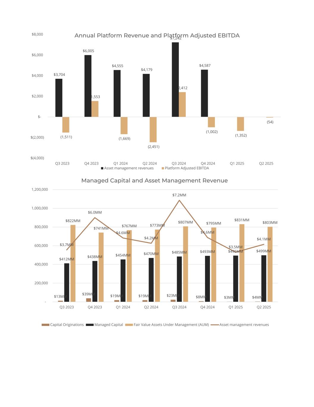$3,704 $6,005 $4,555 $4,179 $7,242 $4,587 (1,511) 1,553 (1,669) (2,451) 2,412 (1,002) (1,352) (54) $(4,000) $(2,000) $- $2,000 $4,000 $6,000 $8,000 Q3 2023 Q4 2023 Q1 2024 Q2 2024 Q3 2024 Q4 2024 Q1 2025 Q2 2025 Annual Platform Revenue and Platform Adjusted EBITDA Asset management revenues Platform Adjusted EBITDA $13MM $39MM $19MM $19MM $23MM $8MM $3MM $4MM $412MM $438MM $454MM $470MM $485MM $493MM $495MM $499MM $822MM $741MM $767MM $773MM $807MM $795MM $831MM $803MM $3.7MM $6.0MM $4.6MM $4.2MM $7.2MM $4.6MM $3.5MM $4.1MM - 200,000 400,000 600,000 800,000 1,000,000 1,200,000 Q3 2023 Q4 2023 Q1 2024 Q2 2024 Q3 2024 Q4 2024 Q1 2025 Q2 2025 Managed Capital and Asset Management Revenue Capital Originations Managed Capital Fair Value Assets Under Management (AUM) Asset management revenues