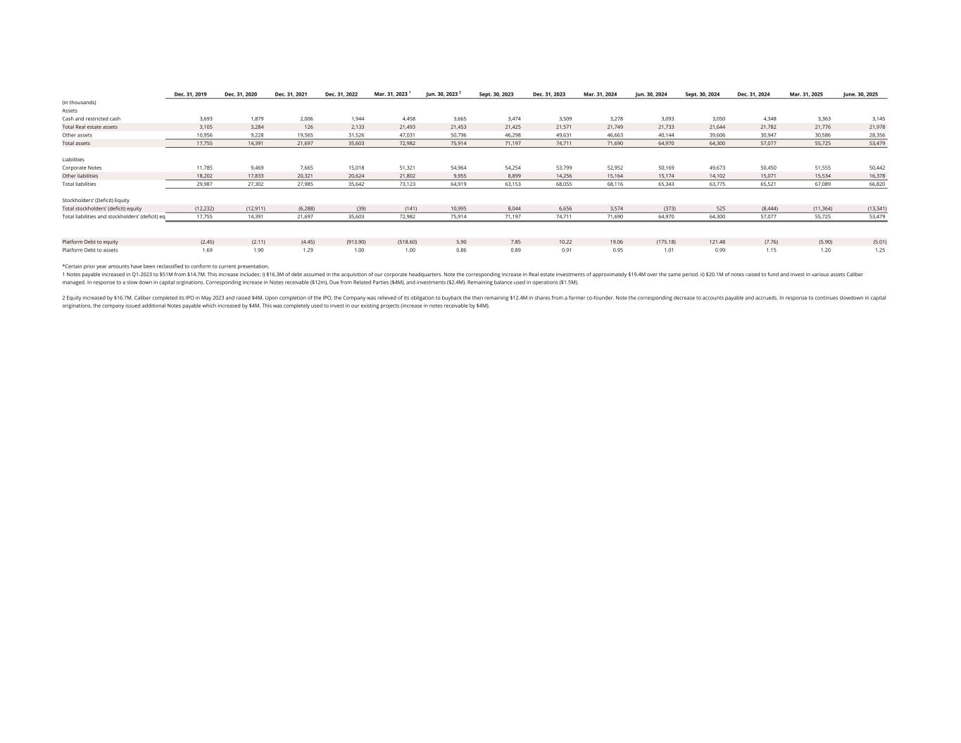 Dec. 31, 2019 Dec. 31, 2020 Dec. 31, 2021 Dec. 31, 2022 Mar. 31, 2023 1 Jun. 30, 2023 2 Sept. 30, 2023 Dec. 31, 2023 Mar. 31, 2024 Jun. 30, 2024 Sept. 30, 2024 Dec. 31, 2024 Mar. 31, 2025 June. 30, 2025 (in thousands) Assets Cash and restricted cash 3,693 1,879 2,006 1,944 4,458 3,665 3,474 3,509 3,278 3,093 3,050 4,348 3,363 3,145 Total Real estate assets 3,105 3,284 126 2,133 21,493 21,453 21,425 21,571 21,749 21,733 21,644 21,782 21,776 21,978 Other assets 10,956 9,228 19,565 31,526 47,031 50,796 46,298 49,631 46,663 40,144 39,606 30,947 30,586 28,356 Total assets 17,755 14,391 21,697 35,603 72,982 75,914 71,197 74,711 71,690 64,970 64,300 57,077 55,725 53,479 Liabilities Corporate Notes 11,785 9,469 7,665 15,018 51,321 54,964 54,254 53,799 52,952 50,169 49,673 50,450 51,555 50,442 Other liabilities 18,202 17,833 20,321 20,624 21,802 9,955 8,899 14,256 15,164 15,174 14,102 15,071 15,534 16,378 Total liabilities 29,987 27,302 27,985 35,642 73,123 64,919 63,153 68,055 68,116 65,343 63,775 65,521 67,089 66,820 Stockholders’ (Deficit) Equity Total stockholders’ (deficit) equity (12,232) (12,911) (6,288) (39) (141) 10,995 8,044 6,656 3,574 (373) 525 (8,444) (11,364) (13,341) Total liabilities and stockholders’ (deficit) eq 17,755 14,391 21,697 35,603 72,982 75,914 71,197 74,711 71,690 64,970 64,300 57,077 55,725 53,479 Platform Debt to equity (2.45) (2.11) (4.45) (913.90) (518.60) 5.90 7.85 10.22 19.06 (175.18) 121.48 (7.76) (5.90) (5.01) Platform Debt to assets 1.69 1.90 1.29 1.00 1.00 0.86 0.89 0.91 0.95 1.01 0.99 1.15 1.20 1.25 *Certain prior year amounts have been reclassified to conform to current presentation. 1 Notes payable increased in Q1-2023 to $51M from $14.7M. This increase includes: i) $16.3M of debt assumed in the acquisition of our corporate headquarters. Note the corresponding increase in Real estate investments of approximately $19.4M over the same period. ii) $20.1M of notes raised to fund and invest in various assets Caliber managed. In response to a slow down in capital orginations. Corresponding increase in Notes receivable ($12m), Due from Related Parties ($4M), and investments ($2.4M). Remaining balance used in operations ($1.5M). 2 Equity increased by $16.7M. Caliber completed its IPO in May 2023 and raised $4M. Upon completion of the IPO, the Company was relieved of its obligation to buyback the then remaining $12.4M in shares from a former co-founder. Note the corresponding decrease to accounts payable and accrueds. In response to continues slowdown in capital originations, the company issued additional Notes payable which increased by $4M. This was completely used to invest in our existing projects (increase in notes receivable by $4M).