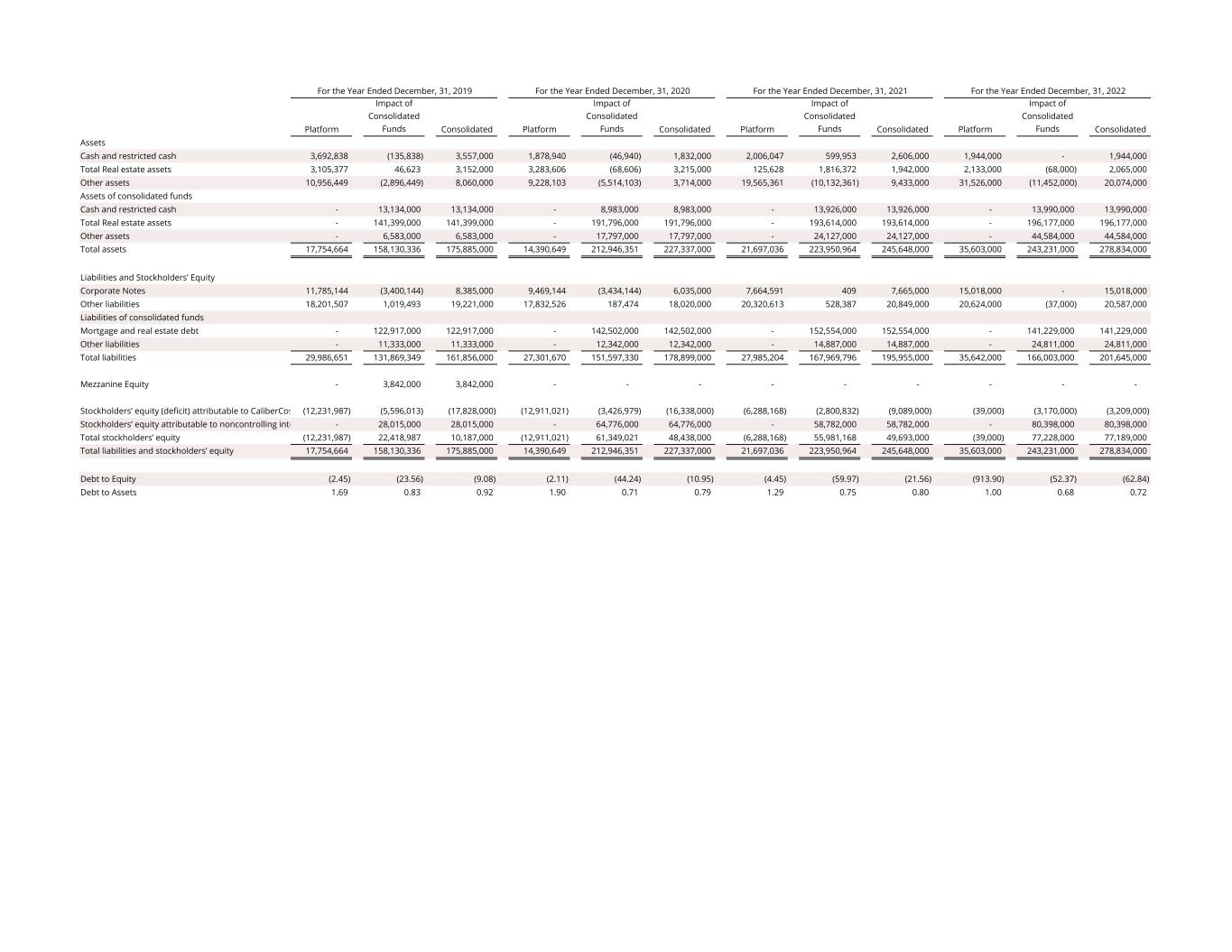 Platform Impact of Consolidated Funds Consolidated Platform Impact of Consolidated Funds Consolidated Platform Impact of Consolidated Funds Consolidated Platform Impact of Consolidated Funds Consolidated Assets Cash and restricted cash 3,692,838 (135,838) 3,557,000 1,878,940 (46,940) 1,832,000 2,006,047 599,953 2,606,000 1,944,000 - 1,944,000 Total Real estate assets 3,105,377 46,623 3,152,000 3,283,606 (68,606) 3,215,000 125,628 1,816,372 1,942,000 2,133,000 (68,000) 2,065,000 Other assets 10,956,449 (2,896,449) 8,060,000 9,228,103 (5,514,103) 3,714,000 19,565,361 (10,132,361) 9,433,000 31,526,000 (11,452,000) 20,074,000 Assets of consolidated funds Cash and restricted cash - 13,134,000 13,134,000 - 8,983,000 8,983,000 - 13,926,000 13,926,000 - 13,990,000 13,990,000 Total Real estate assets - 141,399,000 141,399,000 - 191,796,000 191,796,000 - 193,614,000 193,614,000 - 196,177,000 196,177,000 Other assets - 6,583,000 6,583,000 - 17,797,000 17,797,000 - 24,127,000 24,127,000 - 44,584,000 44,584,000 Total assets 17,754,664 158,130,336 175,885,000 14,390,649 212,946,351 227,337,000 21,697,036 223,950,964 245,648,000 35,603,000 243,231,000 278,834,000 Liabilities and Stockholders’ Equity Corporate Notes 11,785,144 (3,400,144) 8,385,000 9,469,144 (3,434,144) 6,035,000 7,664,591 409 7,665,000 15,018,000 - 15,018,000 Other liabilities 18,201,507 1,019,493 19,221,000 17,832,526 187,474 18,020,000 20,320,613 528,387 20,849,000 20,624,000 (37,000) 20,587,000 Liabilities of consolidated funds Mortgage and real estate debt - 122,917,000 122,917,000 - 142,502,000 142,502,000 - 152,554,000 152,554,000 - 141,229,000 141,229,000 Other liabilities - 11,333,000 11,333,000 - 12,342,000 12,342,000 - 14,887,000 14,887,000 - 24,811,000 24,811,000 Total liabilities 29,986,651 131,869,349 161,856,000 27,301,670 151,597,330 178,899,000 27,985,204 167,969,796 195,955,000 35,642,000 166,003,000 201,645,000 Mezzanine Equity - 3,842,000 3,842,000 - - - - - - - - - Stockholders’ equity (deficit) attributable to CaliberCos (12,231,987) (5,596,013) (17,828,000) (12,911,021) (3,426,979) (16,338,000) (6,288,168) (2,800,832) (9,089,000) (39,000) (3,170,000) (3,209,000) Stockholders’ equity attributable to noncontrolling inte - 28,015,000 28,015,000 - 64,776,000 64,776,000 - 58,782,000 58,782,000 - 80,398,000 80,398,000 Total stockholders’ equity (12,231,987) 22,418,987 10,187,000 (12,911,021) 61,349,021 48,438,000 (6,288,168) 55,981,168 49,693,000 (39,000) 77,228,000 77,189,000 Total liabilities and stockholders’ equity 17,754,664 158,130,336 175,885,000 14,390,649 212,946,351 227,337,000 21,697,036 223,950,964 245,648,000 35,603,000 243,231,000 278,834,000 Debt to Equity (2.45) (23.56) (9.08) (2.11) (44.24) (10.95) (4.45) (59.97) (21.56) (913.90) (52.37) (62.84) Debt to Assets 1.69 0.83 0.92 1.90 0.71 0.79 1.29 0.75 0.80 1.00 0.68 0.72 For the Year Ended December, 31, 2019 For the Year Ended December, 31, 2020 For the Year Ended December, 31, 2021 For the Year Ended December, 31, 2022
