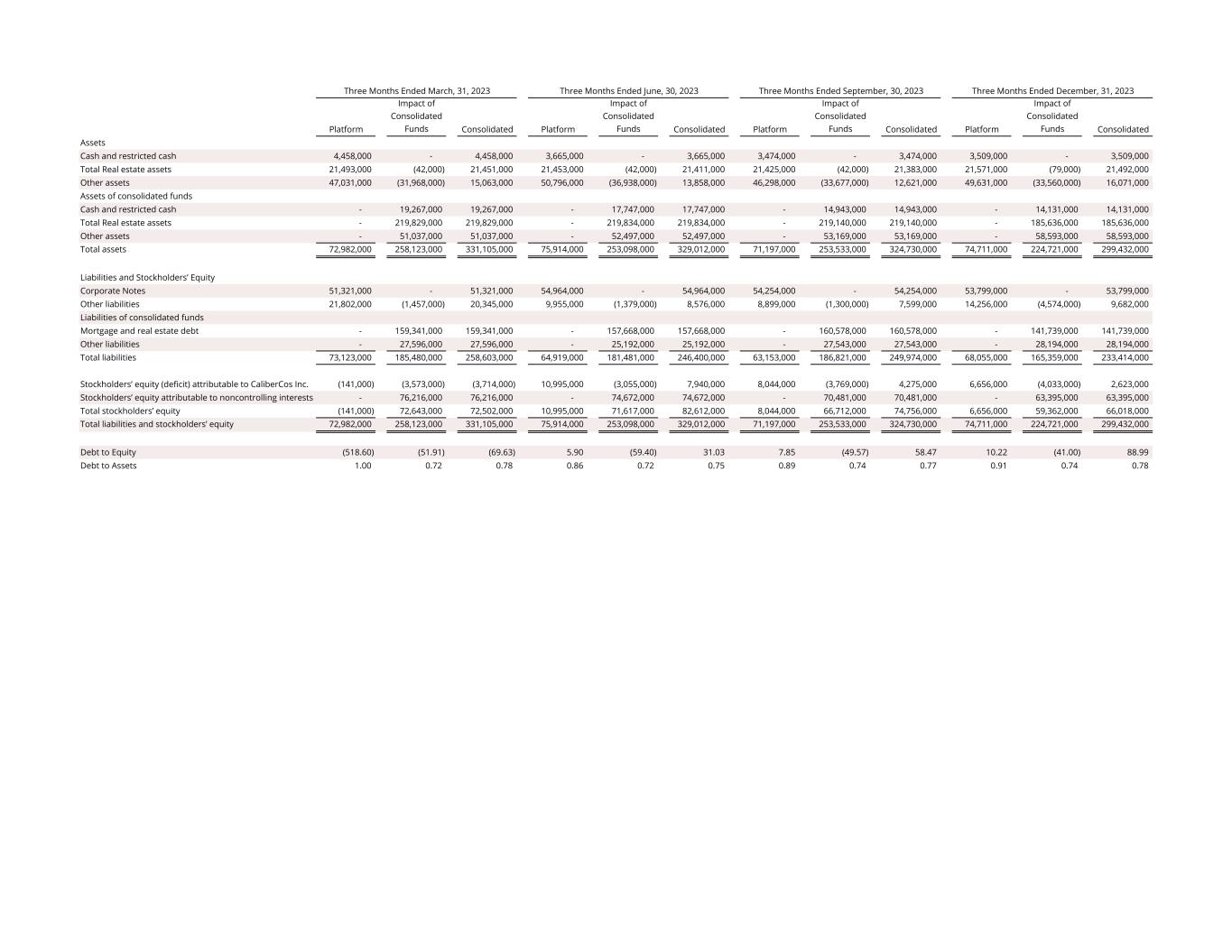 Platform Impact of Consolidated Funds Consolidated Platform Impact of Consolidated Funds Consolidated Platform Impact of Consolidated Funds Consolidated Platform Impact of Consolidated Funds Consolidated Assets Cash and restricted cash 4,458,000 - 4,458,000 3,665,000 - 3,665,000 3,474,000 - 3,474,000 3,509,000 - 3,509,000 Total Real estate assets 21,493,000 (42,000) 21,451,000 21,453,000 (42,000) 21,411,000 21,425,000 (42,000) 21,383,000 21,571,000 (79,000) 21,492,000 Other assets 47,031,000 (31,968,000) 15,063,000 50,796,000 (36,938,000) 13,858,000 46,298,000 (33,677,000) 12,621,000 49,631,000 (33,560,000) 16,071,000 Assets of consolidated funds Cash and restricted cash - 19,267,000 19,267,000 - 17,747,000 17,747,000 - 14,943,000 14,943,000 - 14,131,000 14,131,000 Total Real estate assets - 219,829,000 219,829,000 - 219,834,000 219,834,000 - 219,140,000 219,140,000 - 185,636,000 185,636,000 Other assets - 51,037,000 51,037,000 - 52,497,000 52,497,000 - 53,169,000 53,169,000 - 58,593,000 58,593,000 Total assets 72,982,000 258,123,000 331,105,000 75,914,000 253,098,000 329,012,000 71,197,000 253,533,000 324,730,000 74,711,000 224,721,000 299,432,000 Liabilities and Stockholders’ Equity Corporate Notes 51,321,000 - 51,321,000 54,964,000 - 54,964,000 54,254,000 - 54,254,000 53,799,000 - 53,799,000 Other liabilities 21,802,000 (1,457,000) 20,345,000 9,955,000 (1,379,000) 8,576,000 8,899,000 (1,300,000) 7,599,000 14,256,000 (4,574,000) 9,682,000 Liabilities of consolidated funds Mortgage and real estate debt - 159,341,000 159,341,000 - 157,668,000 157,668,000 - 160,578,000 160,578,000 - 141,739,000 141,739,000 Other liabilities - 27,596,000 27,596,000 - 25,192,000 25,192,000 - 27,543,000 27,543,000 - 28,194,000 28,194,000 Total liabilities 73,123,000 185,480,000 258,603,000 64,919,000 181,481,000 246,400,000 63,153,000 186,821,000 249,974,000 68,055,000 165,359,000 233,414,000 Stockholders’ equity (deficit) attributable to CaliberCos Inc. (141,000) (3,573,000) (3,714,000) 10,995,000 (3,055,000) 7,940,000 8,044,000 (3,769,000) 4,275,000 6,656,000 (4,033,000) 2,623,000 Stockholders’ equity attributable to noncontrolling interests - 76,216,000 76,216,000 - 74,672,000 74,672,000 - 70,481,000 70,481,000 - 63,395,000 63,395,000 Total stockholders’ equity (141,000) 72,643,000 72,502,000 10,995,000 71,617,000 82,612,000 8,044,000 66,712,000 74,756,000 6,656,000 59,362,000 66,018,000 Total liabilities and stockholders’ equity 72,982,000 258,123,000 331,105,000 75,914,000 253,098,000 329,012,000 71,197,000 253,533,000 324,730,000 74,711,000 224,721,000 299,432,000 Debt to Equity (518.60) (51.91) (69.63) 5.90 (59.40) 31.03 7.85 (49.57) 58.47 10.22 (41.00) 88.99 Debt to Assets 1.00 0.72 0.78 0.86 0.72 0.75 0.89 0.74 0.77 0.91 0.74 0.78 Three Months Ended March, 31, 2023 Three Months Ended June, 30, 2023 Three Months Ended September, 30, 2023 Three Months Ended December, 31, 2023