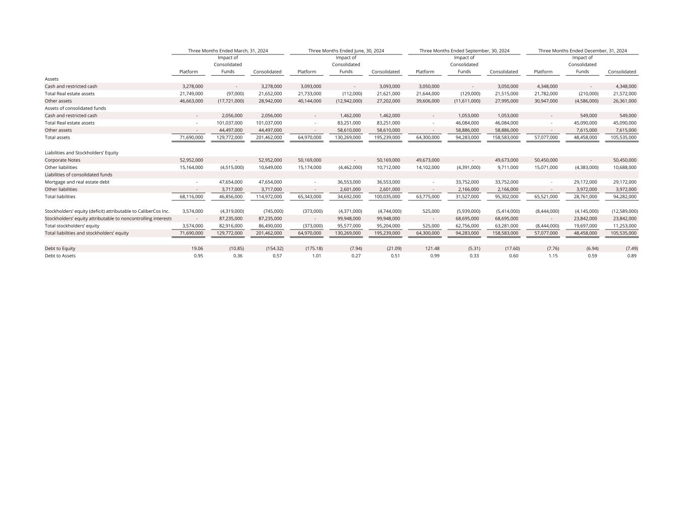 Platform Impact of Consolidated Funds Consolidated Platform Impact of Consolidated Funds Consolidated Platform Impact of Consolidated Funds Consolidated Platform Impact of Consolidated Funds Consolidated Assets Cash and restricted cash 3,278,000 - 3,278,000 3,093,000 - 3,093,000 3,050,000 - 3,050,000 4,348,000 - 4,348,000 Total Real estate assets 21,749,000 (97,000) 21,652,000 21,733,000 (112,000) 21,621,000 21,644,000 (129,000) 21,515,000 21,782,000 (210,000) 21,572,000 Other assets 46,663,000 (17,721,000) 28,942,000 40,144,000 (12,942,000) 27,202,000 39,606,000 (11,611,000) 27,995,000 30,947,000 (4,586,000) 26,361,000 Assets of consolidated funds Cash and restricted cash - 2,056,000 2,056,000 - 1,462,000 1,462,000 - 1,053,000 1,053,000 - 549,000 549,000 Total Real estate assets - 101,037,000 101,037,000 - 83,251,000 83,251,000 - 46,084,000 46,084,000 - 45,090,000 45,090,000 Other assets - 44,497,000 44,497,000 - 58,610,000 58,610,000 - 58,886,000 58,886,000 - 7,615,000 7,615,000 Total assets 71,690,000 129,772,000 201,462,000 64,970,000 130,269,000 195,239,000 64,300,000 94,283,000 158,583,000 57,077,000 48,458,000 105,535,000 Liabilities and Stockholders’ Equity Corporate Notes 52,952,000 - 52,952,000 50,169,000 - 50,169,000 49,673,000 - 49,673,000 50,450,000 - 50,450,000 Other liabilities 15,164,000 (4,515,000) 10,649,000 15,174,000 (4,462,000) 10,712,000 14,102,000 (4,391,000) 9,711,000 15,071,000 (4,383,000) 10,688,000 Liabilities of consolidated funds Mortgage and real estate debt - 47,654,000 47,654,000 - 36,553,000 36,553,000 - 33,752,000 33,752,000 - 29,172,000 29,172,000 Other liabilities - 3,717,000 3,717,000 - 2,601,000 2,601,000 - 2,166,000 2,166,000 - 3,972,000 3,972,000 Total liabilities 68,116,000 46,856,000 114,972,000 65,343,000 34,692,000 100,035,000 63,775,000 31,527,000 95,302,000 65,521,000 28,761,000 94,282,000 Stockholders’ equity (deficit) attributable to CaliberCos Inc. 3,574,000 (4,319,000) (745,000) (373,000) (4,371,000) (4,744,000) 525,000 (5,939,000) (5,414,000) (8,444,000) (4,145,000) (12,589,000) Stockholders’ equity attributable to noncontrolling interests - 87,235,000 87,235,000 - 99,948,000 99,948,000 - 68,695,000 68,695,000 - 23,842,000 23,842,000 Total stockholders’ equity 3,574,000 82,916,000 86,490,000 (373,000) 95,577,000 95,204,000 525,000 62,756,000 63,281,000 (8,444,000) 19,697,000 11,253,000 Total liabilities and stockholders’ equity 71,690,000 129,772,000 201,462,000 64,970,000 130,269,000 195,239,000 64,300,000 94,283,000 158,583,000 57,077,000 48,458,000 105,535,000 Debt to Equity 19.06 (10.85) (154.32) (175.18) (7.94) (21.09) 121.48 (5.31) (17.60) (7.76) (6.94) (7.49) Debt to Assets 0.95 0.36 0.57 1.01 0.27 0.51 0.99 0.33 0.60 1.15 0.59 0.89 Three Months Ended March, 31, 2024 Three Months Ended June, 30, 2024 Three Months Ended December, 31, 2024Three Months Ended September, 30, 2024