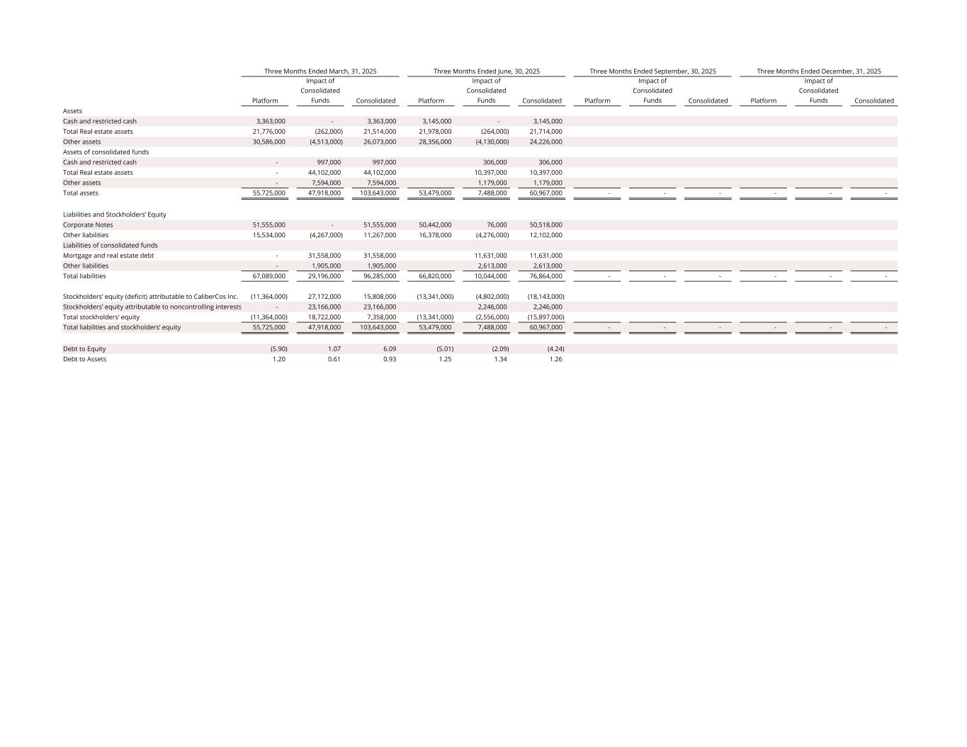 Platform Impact of Consolidated Funds Consolidated Platform Impact of Consolidated Funds Consolidated Platform Impact of Consolidated Funds Consolidated Platform Impact of Consolidated Funds Consolidated Assets Cash and restricted cash 3,363,000 - 3,363,000 3,145,000 - 3,145,000 Total Real estate assets 21,776,000 (262,000) 21,514,000 21,978,000 (264,000) 21,714,000 Other assets 30,586,000 (4,513,000) 26,073,000 28,356,000 (4,130,000) 24,226,000 Assets of consolidated funds Cash and restricted cash - 997,000 997,000 306,000 306,000 Total Real estate assets - 44,102,000 44,102,000 10,397,000 10,397,000 Other assets - 7,594,000 7,594,000 1,179,000 1,179,000 Total assets 55,725,000 47,918,000 103,643,000 53,479,000 7,488,000 60,967,000 - - - - - - Liabilities and Stockholders’ Equity Corporate Notes 51,555,000 - 51,555,000 50,442,000 76,000 50,518,000 Other liabilities 15,534,000 (4,267,000) 11,267,000 16,378,000 (4,276,000) 12,102,000 Liabilities of consolidated funds Mortgage and real estate debt - 31,558,000 31,558,000 11,631,000 11,631,000 Other liabilities - 1,905,000 1,905,000 2,613,000 2,613,000 Total liabilities 67,089,000 29,196,000 96,285,000 66,820,000 10,044,000 76,864,000 - - - - - - Stockholders’ equity (deficit) attributable to CaliberCos Inc. (11,364,000) 27,172,000 15,808,000 (13,341,000) (4,802,000) (18,143,000) Stockholders’ equity attributable to noncontrolling interests - 23,166,000 23,166,000 2,246,000 2,246,000 Total stockholders’ equity (11,364,000) 18,722,000 7,358,000 (13,341,000) (2,556,000) (15,897,000) Total liabilities and stockholders’ equity 55,725,000 47,918,000 103,643,000 53,479,000 7,488,000 60,967,000 - - - - - - Debt to Equity (5.90) 1.07 6.09 (5.01) (2.09) (4.24) Debt to Assets 1.20 0.61 0.93 1.25 1.34 1.26 Three Months Ended March, 31, 2025 Three Months Ended June, 30, 2025 Three Months Ended September, 30, 2025 Three Months Ended December, 31, 2025